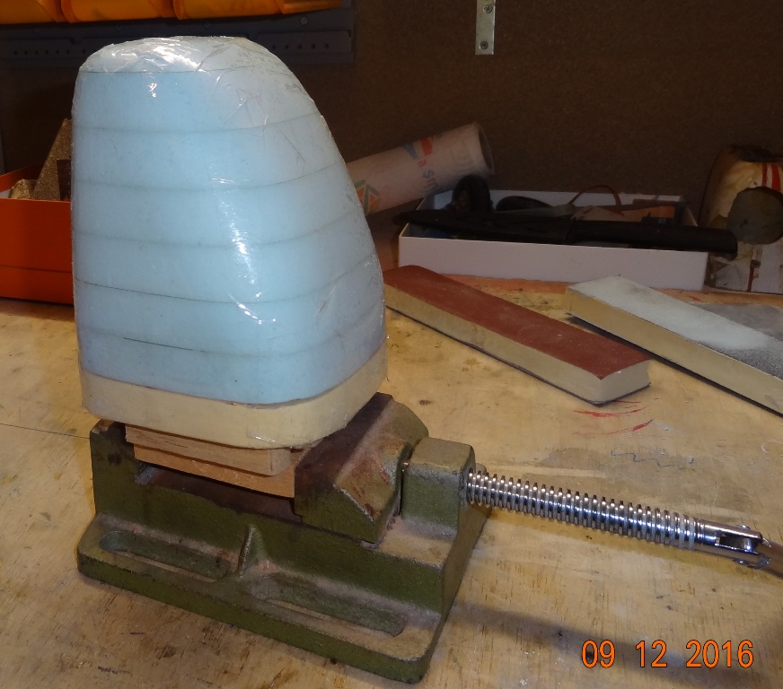 La forme encore légèrement reprise par ponçage est tout d'abord enveloppée de scotch large (peut-être arriverai-je à récupérer le master ???) et solidement fixée.