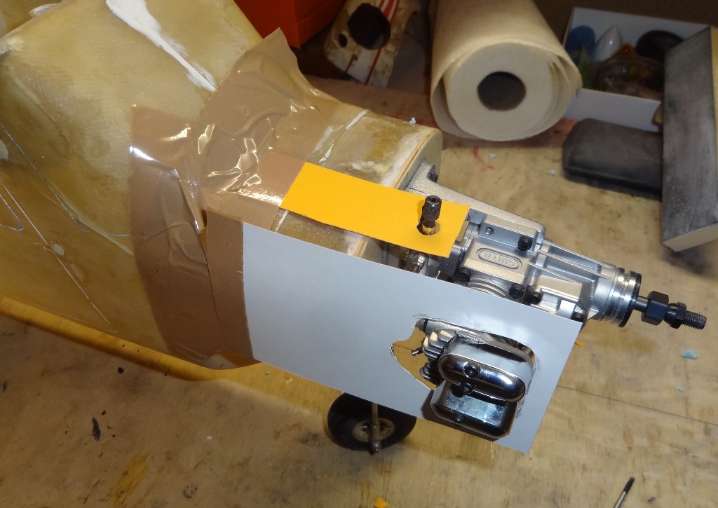 On aurait probablement pu monter le moteur cylindre vers le bas mais la question ne s'est pas posée pour moi car je trouve que la mise en oeuvre n'est pas facile dans cette configuration. Tant pis pour l'aspect maquette, j'ai une préférence pour les moteurs tournés de 90° sur la droite. Ils sont bien accessibles, plus discrets qu'en vertical et souvent on arrive à bien loger le silencieux. D'ailleurs je ne cherche pas spécialement à cacher ces beaux cylindres de Saïto, je trouve cela assez beau. J'ai une tendance à ouvrir assez largement mes capots (ici je n'avais pas le choix, il fallait que j'élargisse même vers l'arrière afin de pouvoir "enrouler" le capot autour du moteur en place (il y avait une possibilité de limiter cette ouverture en démontant les cache culbuteurs pour la mise en place. Je ne l'ai pas retenue, préférant toujours la simplicité)
