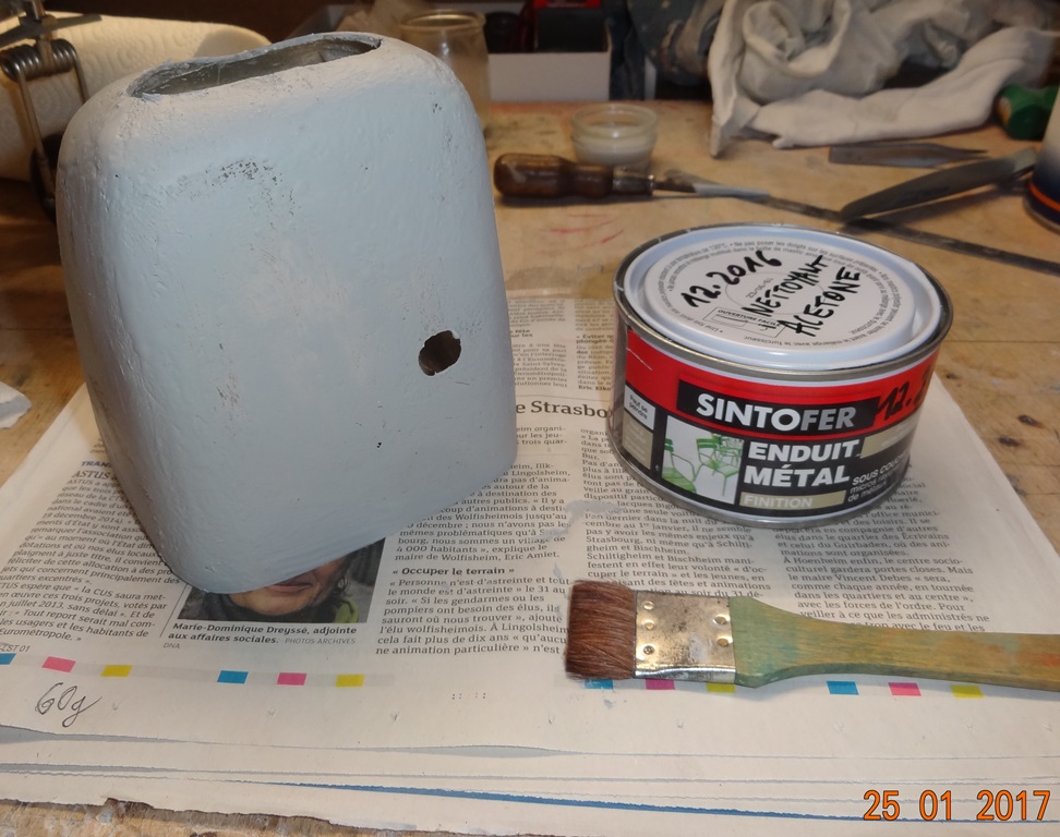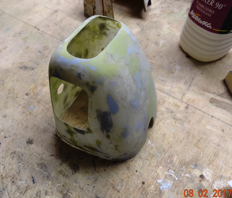 Vu par transparence au dernier ponçage on constate que toutes ces couches de spray (vert) ou d'enduit (gris) ont pratiquement disparu. Donc pas d'augmentation de poids