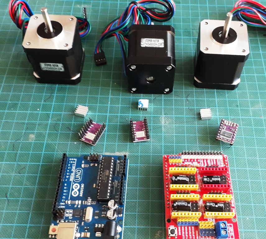 Voici le matériel Je n'utilise que ceci pour l'instant. Ont été livrés au total 5 contrôleurs de moteurs DRV8825 (pour 3 moteurs ?) et 5 butées de fin de course avec câblage + plus 3 équerres métalliques pour la fixation des moteurs.