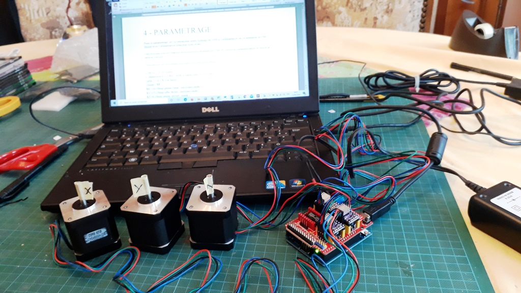 Bonne surprise pour les moteurs : il s'agit de moteurs qui ont 1 cm de plus en hauteur que ceux de ma CNC 3018 et le double en couple. ceci permettra peut-être un upgrade de cette CNC ensuite la carte Arduino "made in Italy" (en supposant qu'il ne s'agisse pas d'une contrefaçon?) et le CNC shield Et voici le tout câblé et relié à l'ordinateur. Je n'ai pas encore pu régler le micro stepping à défaut de cavaliers fournis (commande en cours ...) j'ai donc saisi des paramètres Grbl en conséquence, que je modifierai ultérieurement.