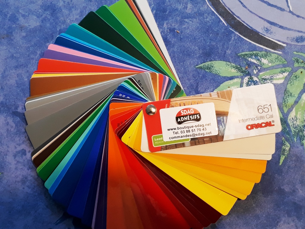 je reviens sur le sujet juste pour dire que je viens de faire l'acquisition d'un nuancier correspondant au vinyl que je commande habituellement, la référence "ORACAL 651", c'est la moins chère, mais très facile d'emploi et largement suffisante pour nos besoins de décoration. (je commence à avoir un peu d'expérience) Si quelqu'un souhaite faire une commande je tiens ce nuancier à sa disposition.