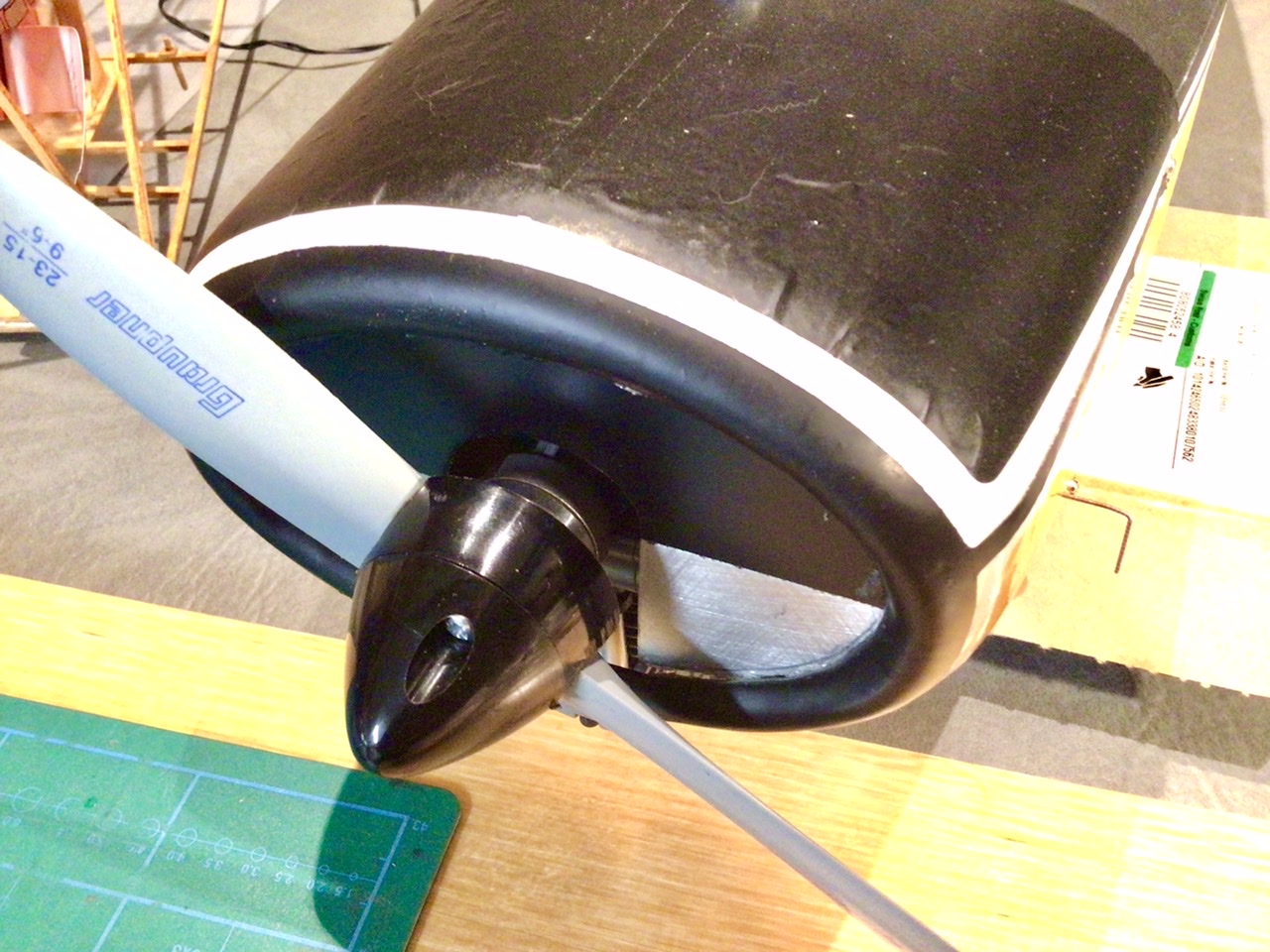 Capot terminé ;), j’ai masqué l’avant pour réduire l’entrée d’air, mais une fois l’hélice et son cône, montés, je réalise que l’ouverture est trop faible, il faudra agrandir l’entrée d’air.