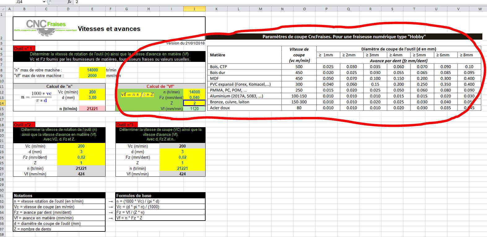 L'effort de coupe soumet la fraise à une contrainte de flexion rotative ; pour éviter une rupture de l'outil il faut que cette contrainte reste dans le domaine des déformations élastiques. Sur des fraises de petits diamètres l'avance par dent est réduite pour limiter cette contrainte. Une fraise de plus gros diamètre, plus rigide, supportera une avance plus importante, et également une profondeur de passe plus importante. La contrainte dépend de la section du copeau (avance /dent x hauteur du copeau).Ce tableau a l'avantage d'exister mais parfois j'ai du mal à en comprendre la logique. Par exemple pour les 3 lignes de métaux les valeurs sont identiques pour les petites fraises et diffèrent pour les grands diamètres.