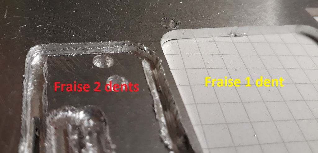 Sur la photo on voit à droite la découpe d'avant-hier avec la fraise 1 dent et à gauche celle d'aujourd'hui, avec la fraise deux dents Au moment du fraisage, qu'on verra sur une vidéo ci-dessous, on constate qu'il n'y a presque pas de copeaux, mais du déchirement de l'alu qui fait des bavures en bordure de coupe.