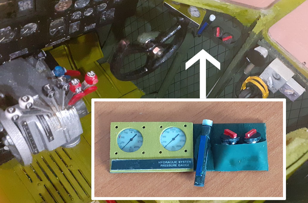 Ici le sélecteur d'antenne et le boitier de contrôle d'antenne filiaire, les jauges avec les clapets ou vannes je ne sais pas exactement, des systèmes hydrauliques côté co-pilote...