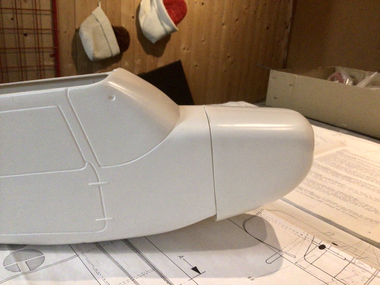 1ère chose, séparer le capot du fuselage puis on l’ajuste sur le fuselage. La cloison par feu est ensuite préparée, soit montage du bâti moteur qui a été un peu retouché pour faire passer le moteur OS 30, et percée en son centre pour le bouchon du réservoir. Et enfin la cloison a également été ajustées au plus près pour s’emboîter sur le fuselage. Le tout a été collé à la UHU acrylique, je ne me souviens pas très bien de la couleur de Stabilit Express, mais il me semble qu’elle était blanche, ce qui n’est pas le cas de la UHU, qui a une vilaine couleur brune, ce qui ressort bien sûr le blanc du Plura si on est pas soigneux. J’ai réussi à nettoyer les petits débordements à l’alcool à brûler. Les vis du bâti moteur qui dépassaient à l’intérieur du fuselage ont été arasées pour éviter au réservoir d’être percé en cas de choc.