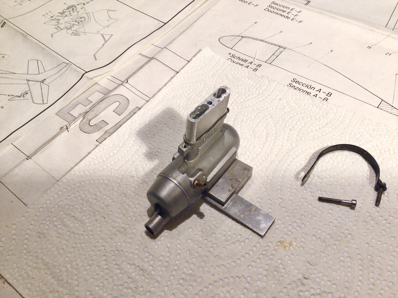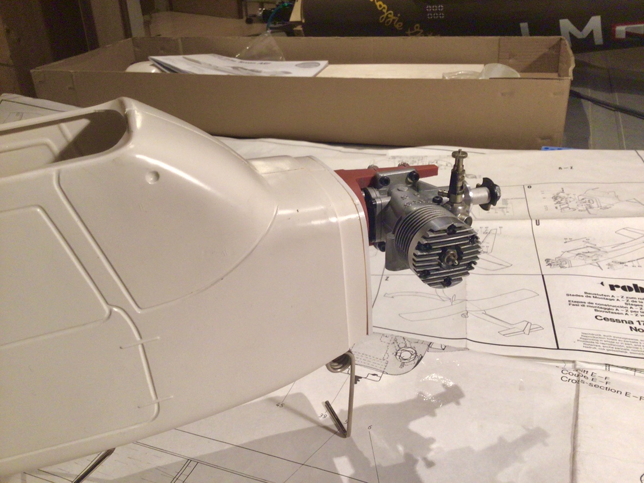 Et deux petites dernières pour la fin de soirée. Le train d’atterrissage a été monté et le moteur fixé au bâti. J’ai remplacé les vis dont deux étaient trop courtes par des vis imbus et les écrous livrés avec le kit, par des nylstop. Le réservoir préconisé par la notice pour le moteur moteur Enya 19 qui est un 3.5cm3, étant un 150ml, pour le 5cm3, j’ai prévu un réservoir de 200ml. Il faudra une extension de 20mm pour éloigner le pot d’échappement du fuselage, elle sera fabriquée dans une plaque en aluminium.