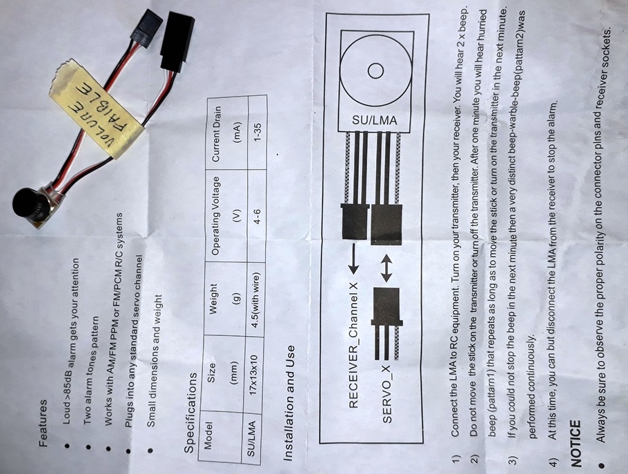 Il émet un bip unique au moment du branchement, puis, une minute assez exactement après la coupure du récepteur, il commence à émettre des bips isolés stridents espacés de 3 à 4 secondes chacun. Après une minute de ces signaux, ces derniers se transforment en une mélodie de quelques notes, qui sont répétées indéfiniment jusqu'à la coupure de l'alimentation sur le modèle (la remise en route du Tx ne les arrête pas.