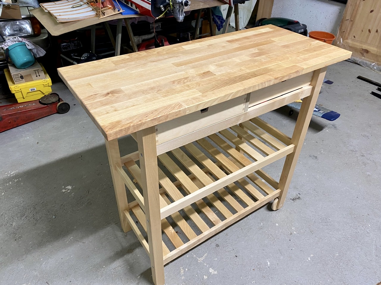 Avant de commencer, j’ai décidé de consacrer un peu de temps pour améliorer mon confort. Tout d’abord j’ai convertis une desserte de cuisine IKEA en établi mobile pour mon imprimante 3D, ce qui me permet de la sortir du garage où il fait un froid de canard peu favorable à cet exercice et l’installer dans une zone tempérée