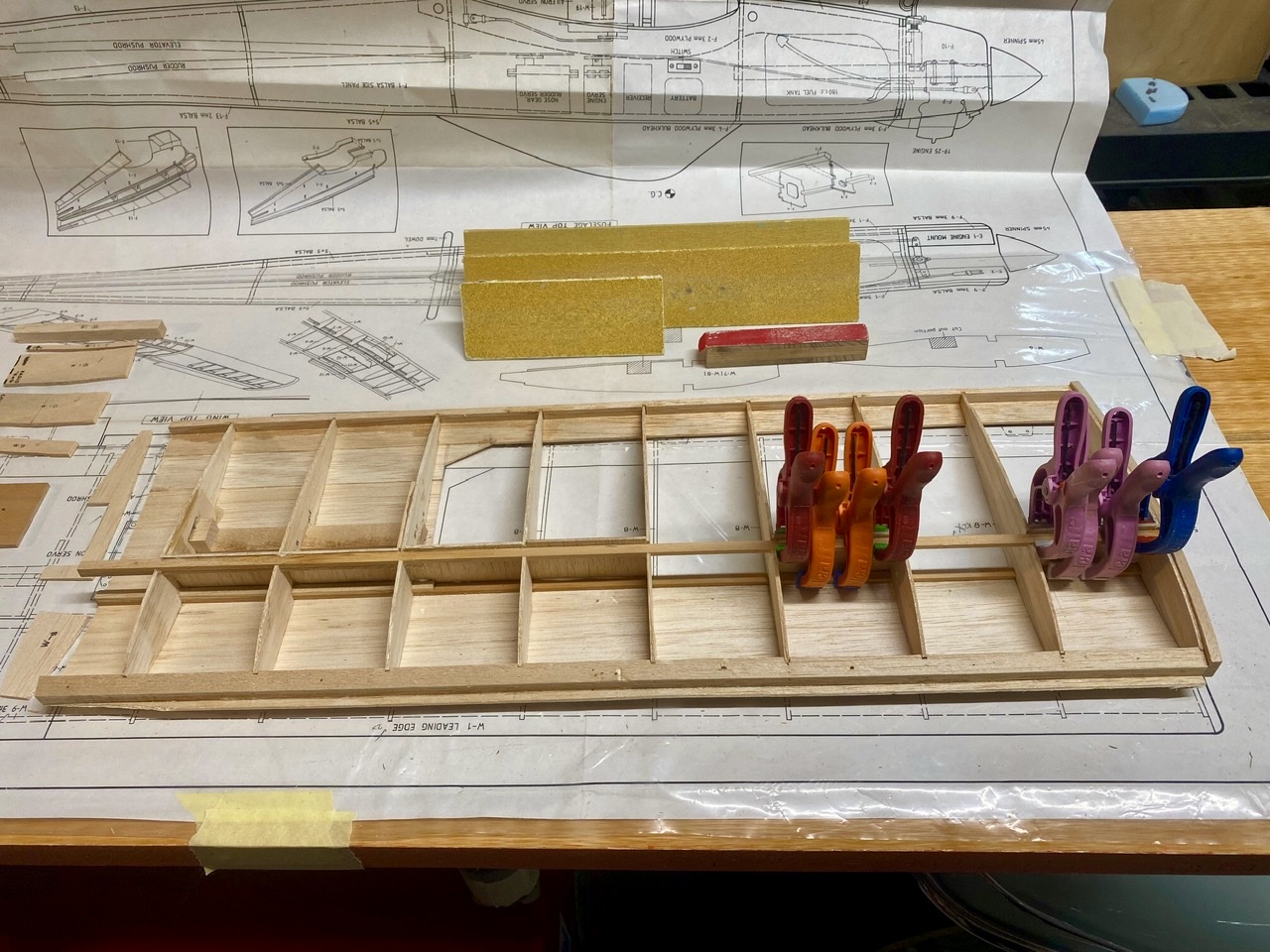 Mais l’essentiel de la journée a été consacré à la construction de la première demi-aile. L’aile sera en une pièce avec un dièdre 2,5 degrés, les deux demi-ailes sont assemblée par 4 petites clefs d’ailes en CTP. Les ailerons sont full span et activés par un seul servo au centre de l’aile, comme c’était souvent le cas sur les modèles de cette génération.