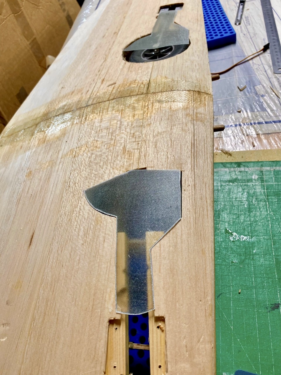 Les emplacements pour les trappes seront découpés quand le collage sera terminé. Les logements intérieurs en balsa seront collés en passant par l’extra dos qui n’est pas encore coffré