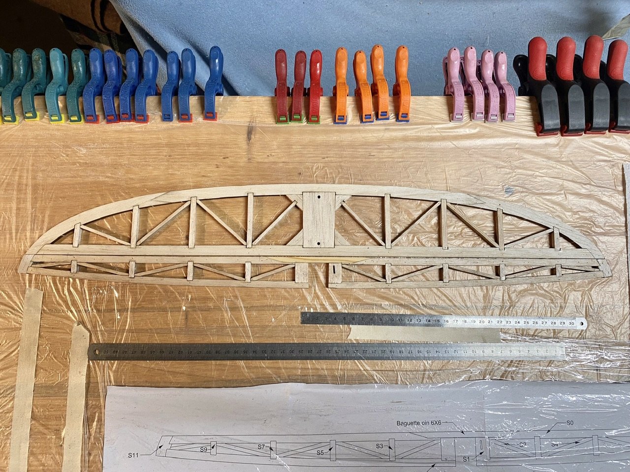 J’ai ensuite entamé la construction des deux sections extérieures de l’aile. La construction est identique à la partie centrale. Coffrage d’intrados sur le plan, longeron en pin et bords de fuite et colle les nervures. Petite remarque importante qui n’est pas indiqué dans la notice: les bords de fuite ont un sens de montage qui tient compte du dièdre de 3 degrés et de l’emplacement des servos, donc veiller à bien les positionner. Délicates attentions du constructeur qui prévoit des gabarits pour vérifier la forme du bord d’attaque, d’une équerre à 90 degrés et une pour l’inclinaison respectant les 3 degrés du dièdre.
