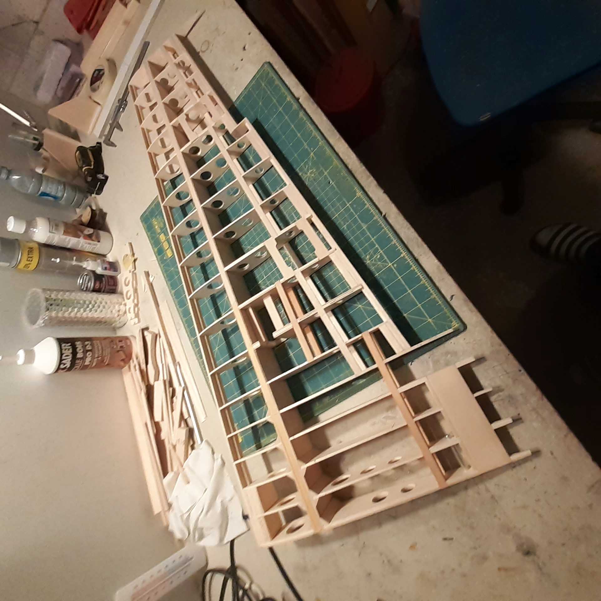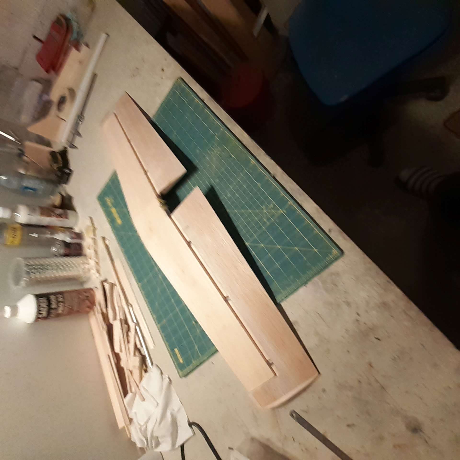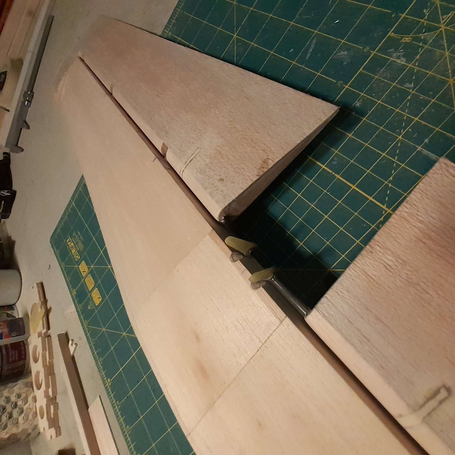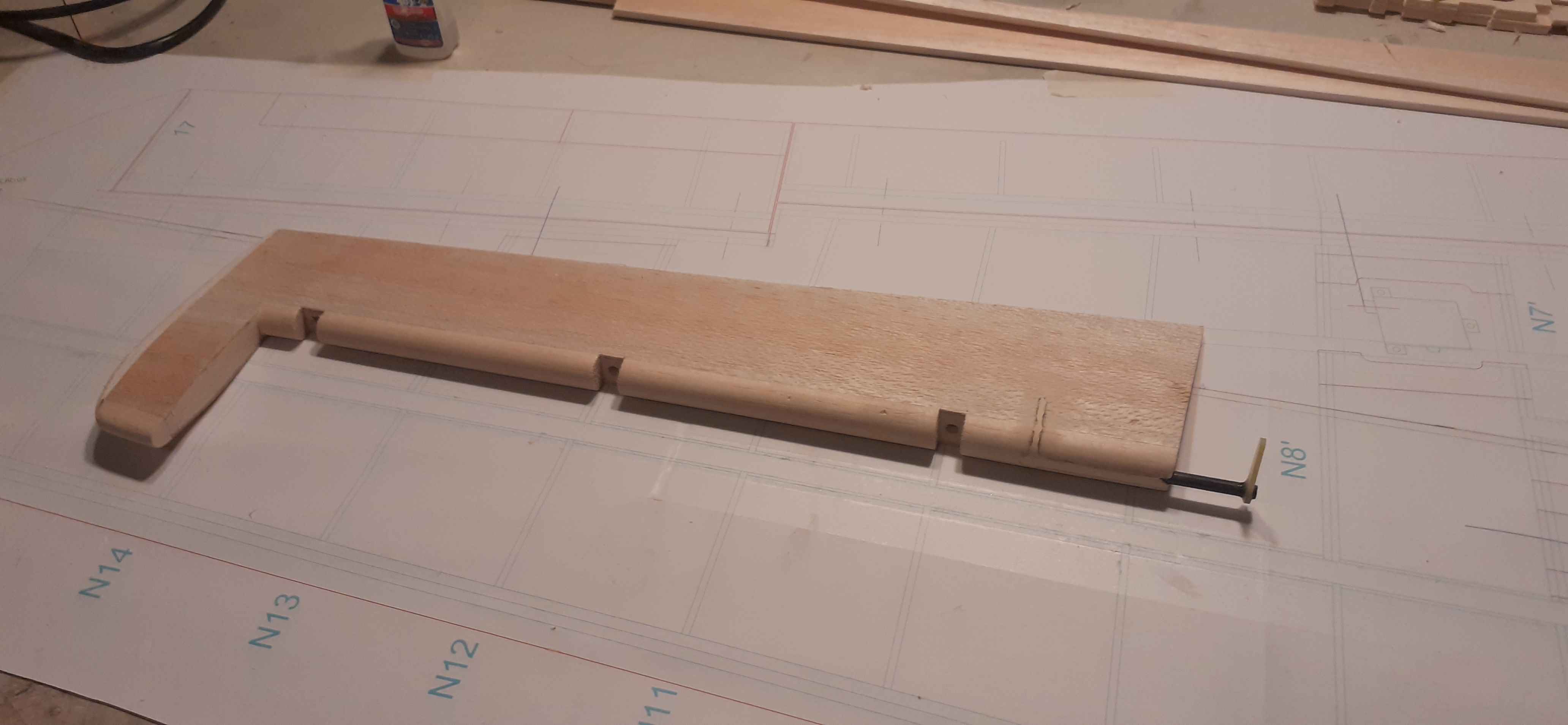 Fabrication des longerons des ailes. Une partie en pin puis le reste en balsa.