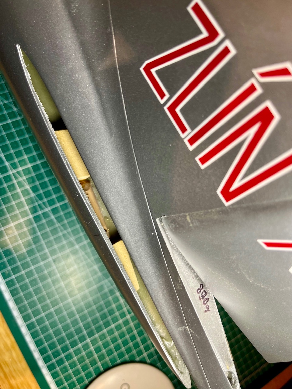 La fixation se fera avec deux vis M3 par en dessous. Des blocs en abachi ont été collés dans le fuselage à l’époxy et serviront d’appui aux têtes des vis.