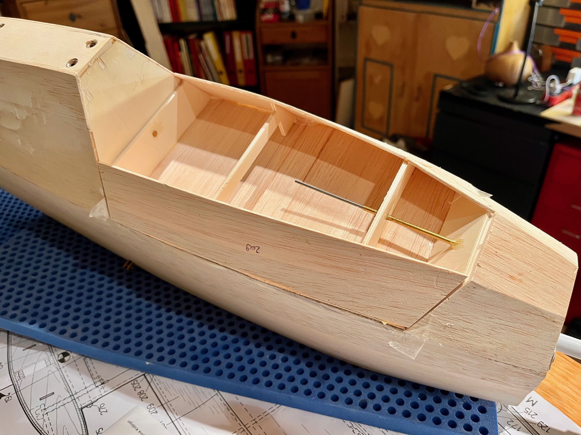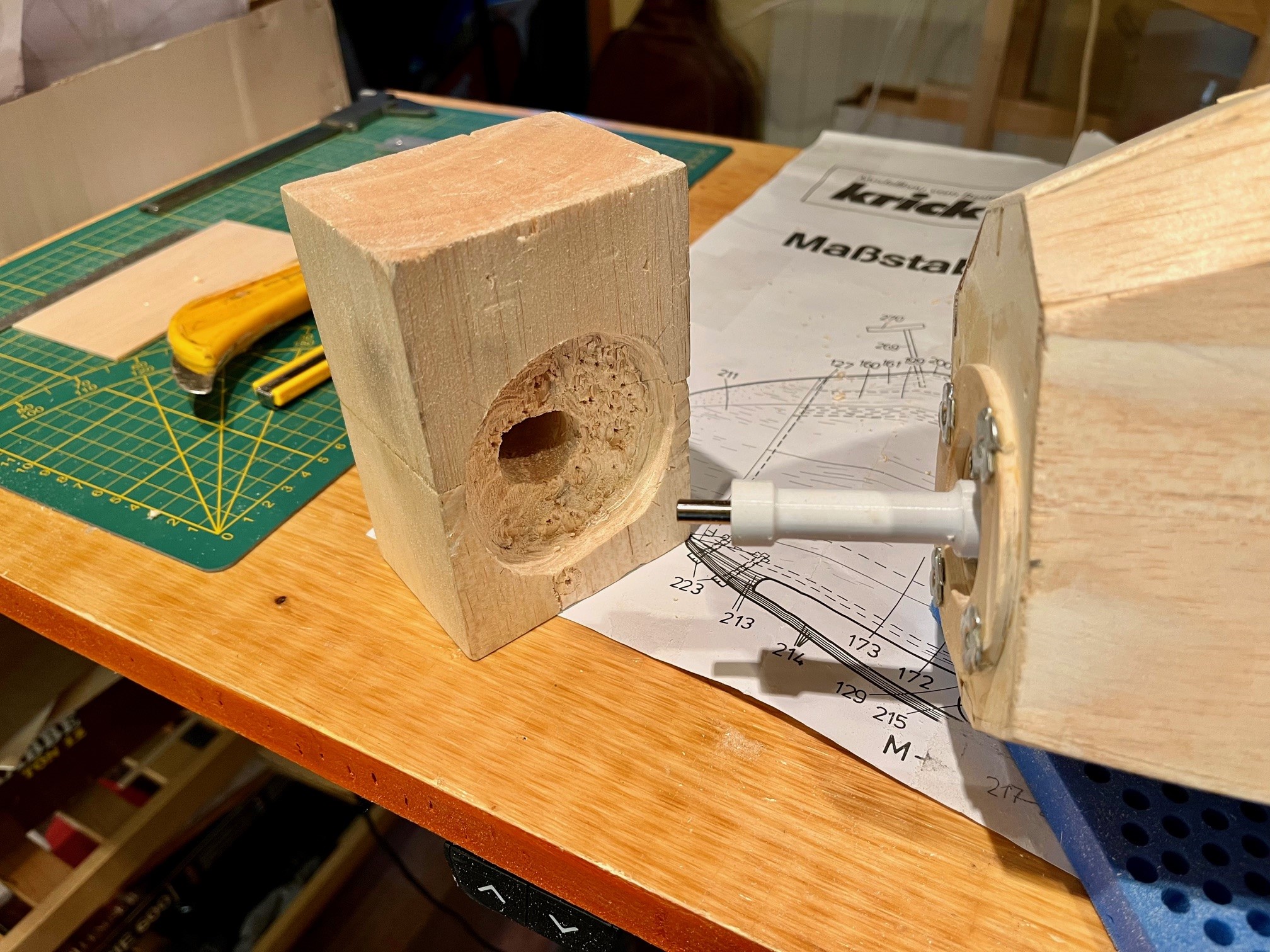 Après avoir déterminé l'emplacement de l'axe du moteur, j'ai dû lui faire de la place en creusant le bloc de balsa. L'idéal aurait été de lui faire un nez en fibre comme je l'avais fait sur le Kranich, mais sur un modèle qui sera recouvert de CTP, ce n'est pas le plus élégant, c'est la raison pour laquelle j'ai conservé la solution prévue par Krick.