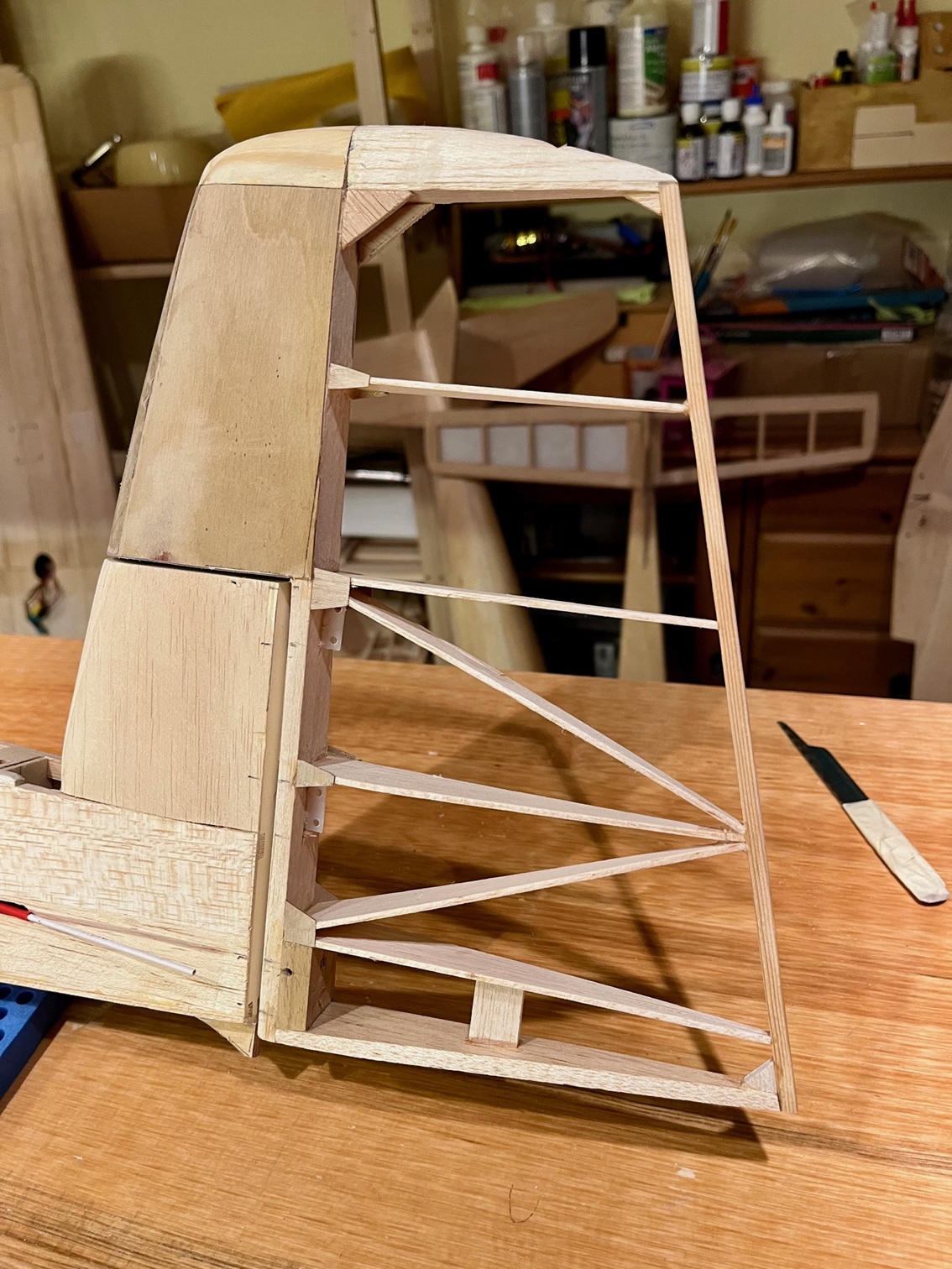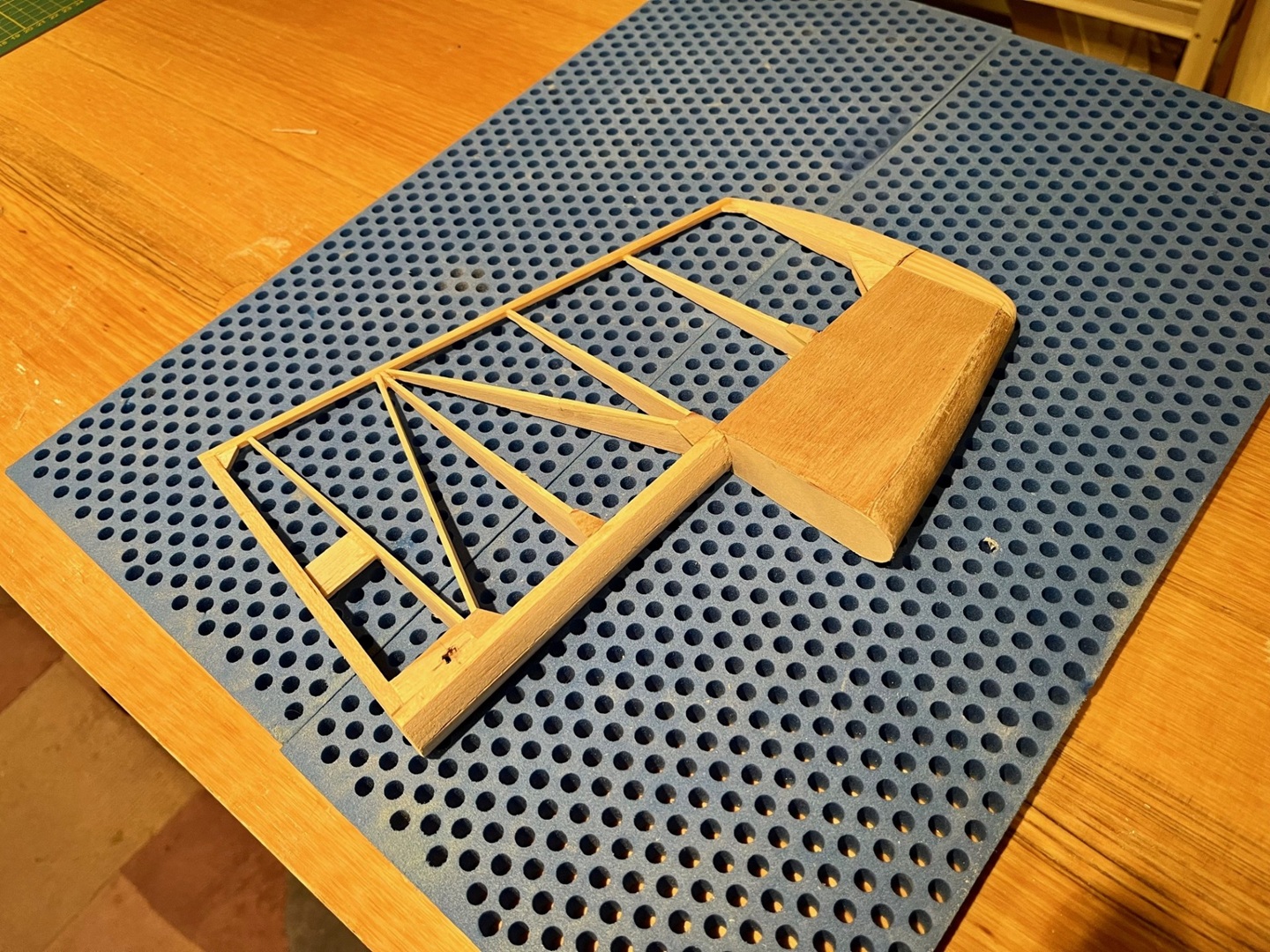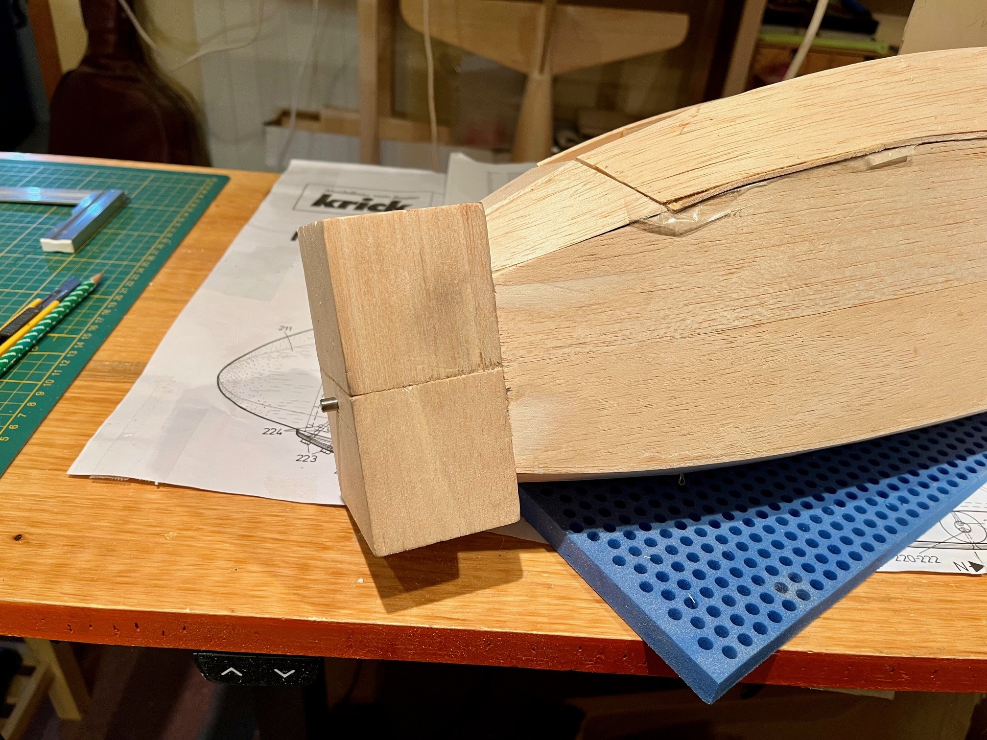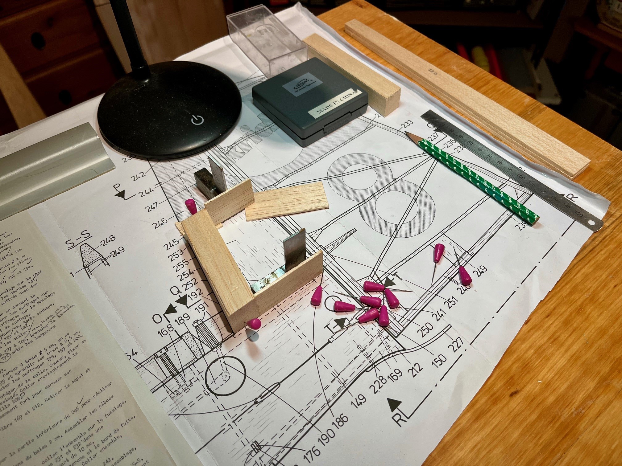 Puis construction de la dérive...je me souviens que notre ami Dhanz avait évoqué une étape compliquée. Je confirme la construction de cet élément et du gouvernail demande pas mal de réflexions et d'attention, ceci notamment parce qu'elle est dégressive sur deux axes et qu'il faut caler le chantier correctement pour ne pas se retrouver avec une pièce de travers...