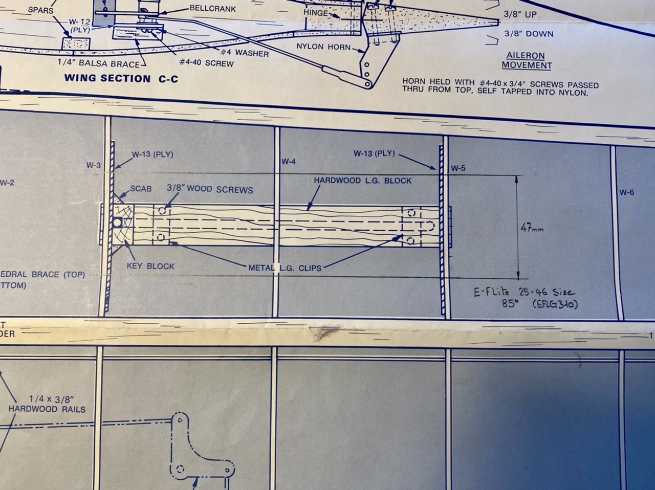 Petit détail, sur les kits Top Flite des années ‘70, comme souvent à cette époque, il n’est proposé qu’une version à train fixe. C’est au constructeur de modifier le kit pour installer un train rentrant . Pour ma part, possédant encore un train E Flite ouvrant à 85 degrés, il ira très bien sur le modèle.