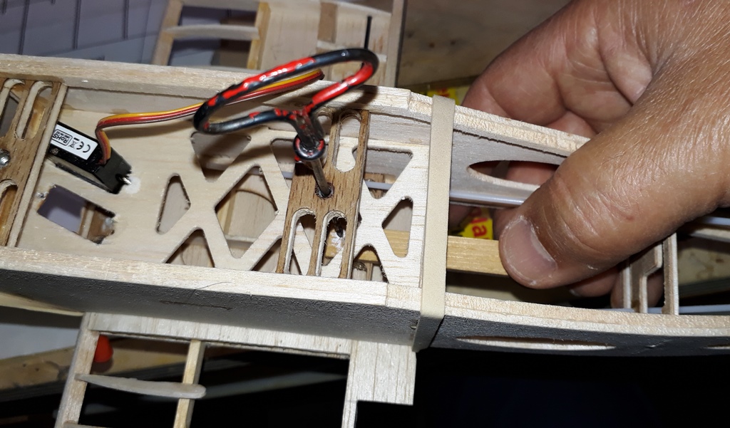 Pour ce point, un petit correctif pour Luc, pour la CNC : La traverse AR de l'aile basse supportant l'écrou ne tombe pas à l'emplacement du plan car le renfort marginal du fuselage en balsa 3 mm, sur lequel elle s'appuie, n'est pas conforme au plan. Cette traverse est un peu plus en avant, ce qui fait que la vis ne passe pas dans le BF, mais dans la partie creuse de l'aile, où il faudra penser à mettre un renfort avant coffrage.