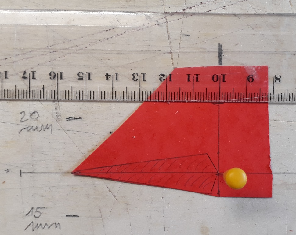 Voici le montage : un morceau de carton représentant la gouverne épinglé sur le plan de travail à son axe de rotation. La règle va servir aux mesures