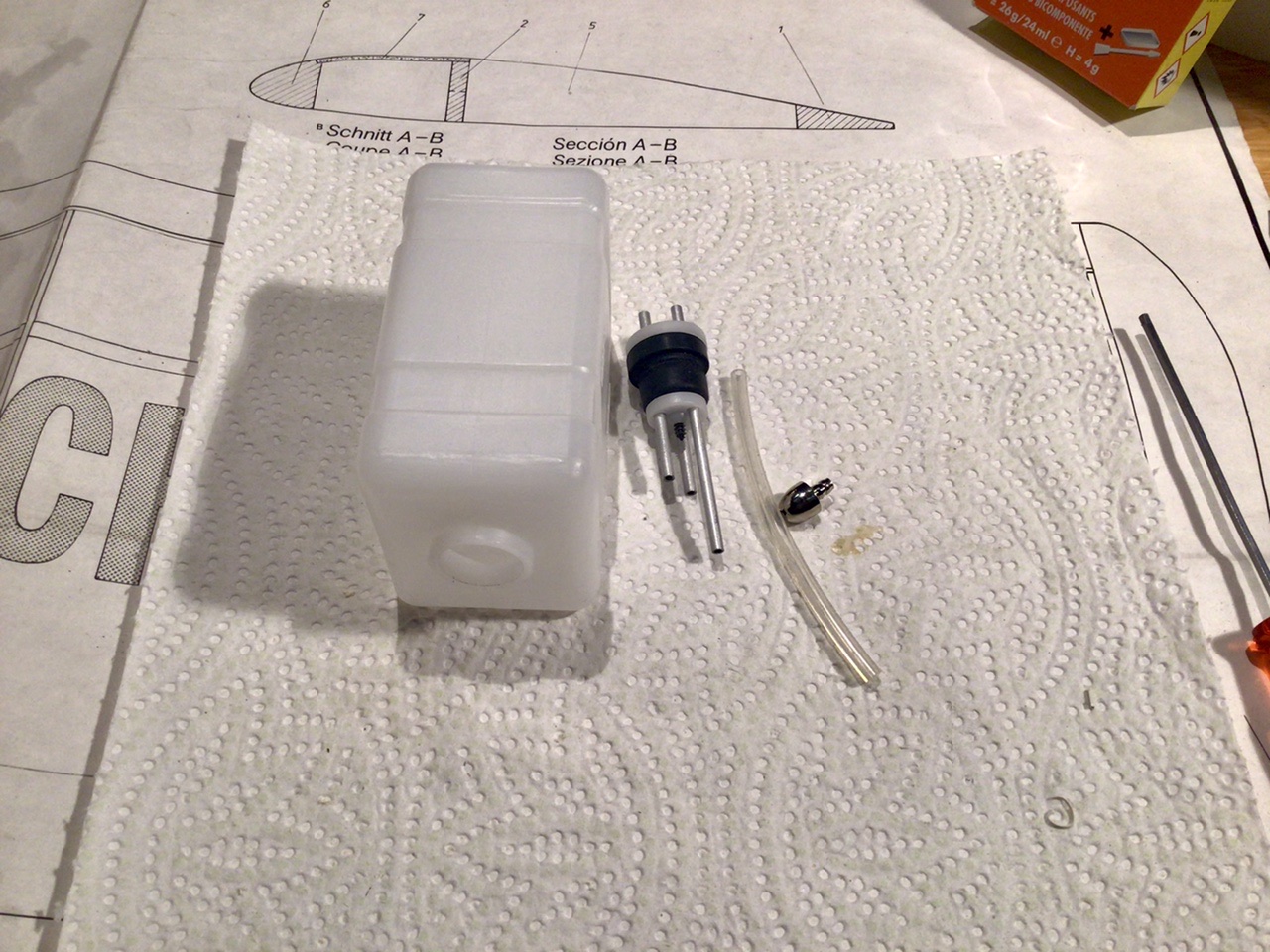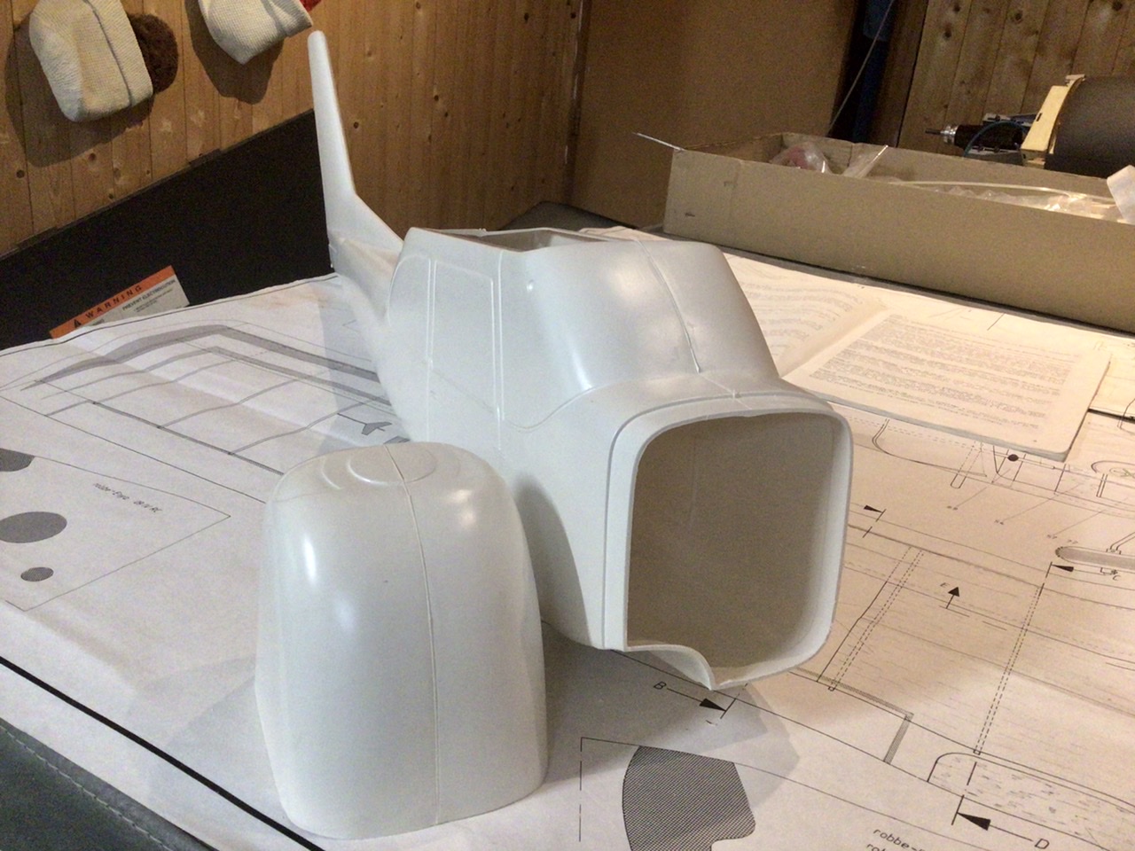 1ère chose, séparer le capot du fuselage puis on l’ajuste sur le fuselage. La cloison par feu est ensuite préparée, soit montage du bâti moteur qui a été un peu retouché pour faire passer le moteur OS 30, et percée en son centre pour le bouchon du réservoir. Et enfin la cloison a également été ajustées au plus près pour s’emboîter sur le fuselage. Le tout a été collé à la UHU acrylique, je ne me souviens pas très bien de la couleur de Stabilit Express, mais il me semble qu’elle était blanche, ce qui n’est pas le cas de la UHU, qui a une vilaine couleur brune, ce qui ressort bien sûr le blanc du Plura si on est pas soigneux. J’ai réussi à nettoyer les petits débordements à l’alcool à brûler. Les vis du bâti moteur qui dépassaient à l’intérieur du fuselage ont été arasées pour éviter au réservoir d’être percé en cas de choc.