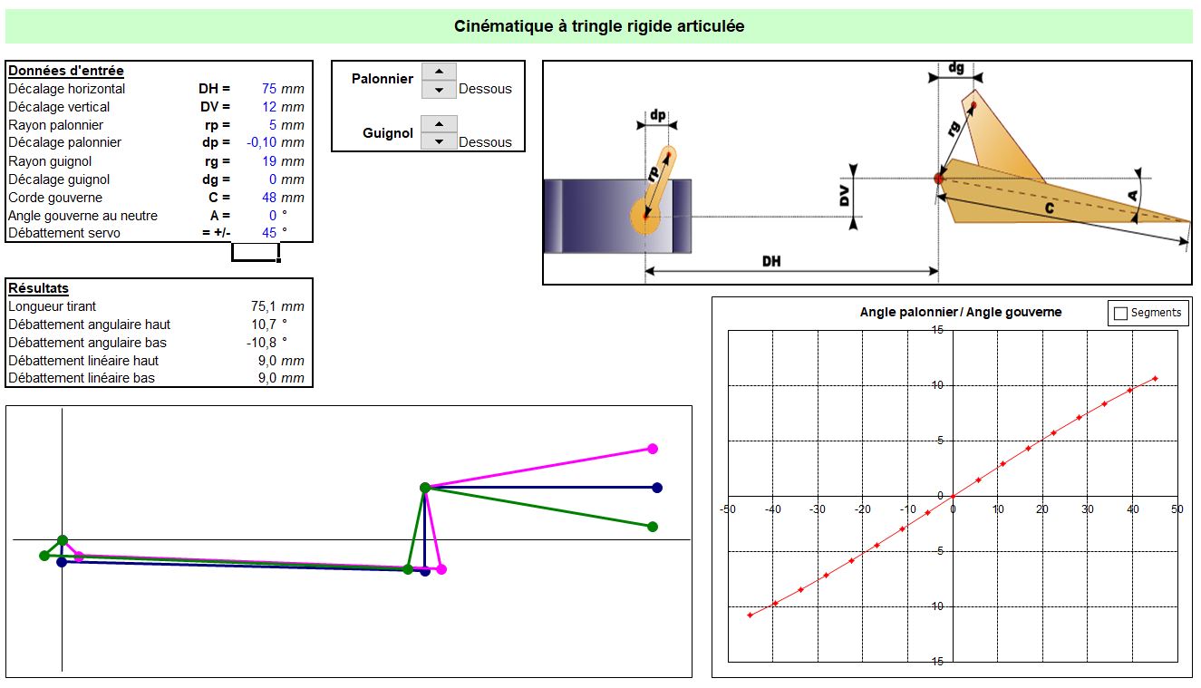 Il est vrai qu'une approche plus empirique avec des longueurs de palonnier et de guignols à la louche pourrait suffire. Au besoin une compensation par la course des servos pouvant ramener aux valeurs souhaitées.