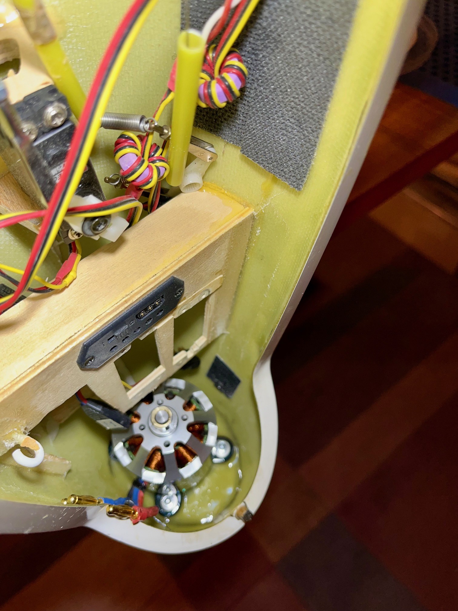 Le récepteur est juste posé provisoirement. Le contrôleur et l’accu 5S viendront installés sur le flanc droit du fuselage, l’accu life destiné à la réception, à l’opposé contre le flanc gauche.