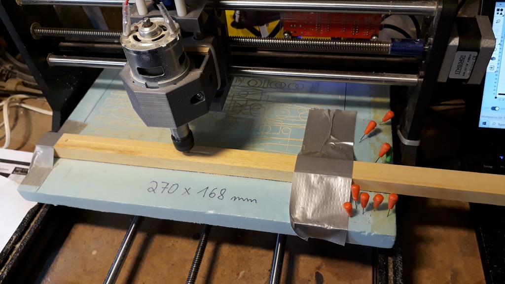 pour rainurer les tasseaux support de train j'ai aussi utilisé la CNC, mais la fixation de la pièce est un peu délicate ici (on peut dépasser en largeur car la fraise ne se déplace (presque) pas sur l'axe Y. On pourrait aussi utiliser une scie circulaire pour ce travail en faisant quelques essais de profondeur et de largeur