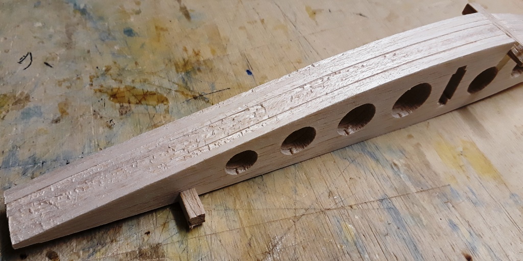 Cette nervure N1 intègre aussi la découpe du tasseau support de train, qui sera en Samba de section 20 x 15 mm (ramené à 15 mm de large au niveau des nervures pour garder un peu de matière à l'avant du tasseau. 20 mm sur le reste de la largeur pour garantir une bonne prise pour les vis des cavaliers de blocage de la CAP du train)
