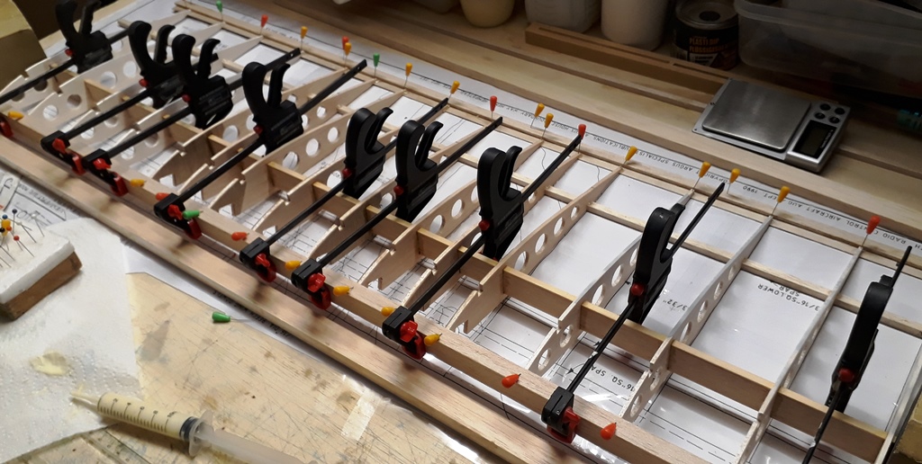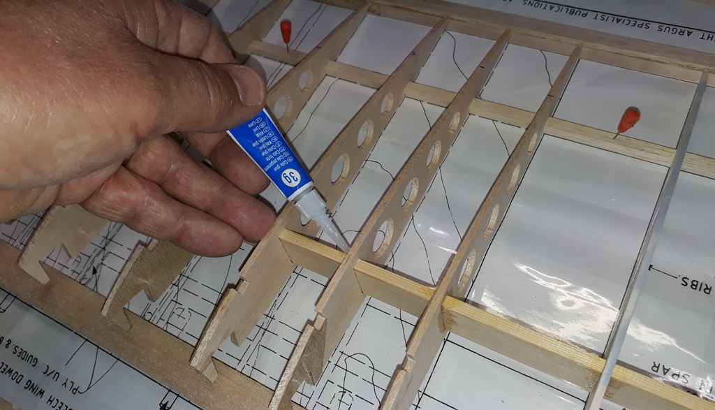 A la jonction N2bis et N3, on distingue dans l'encoche du longeron le passage des clés de dièdre en CTP 1.5 mm, non prévues sur le plan original, qui se contentait de coller nervure contre nervure.
