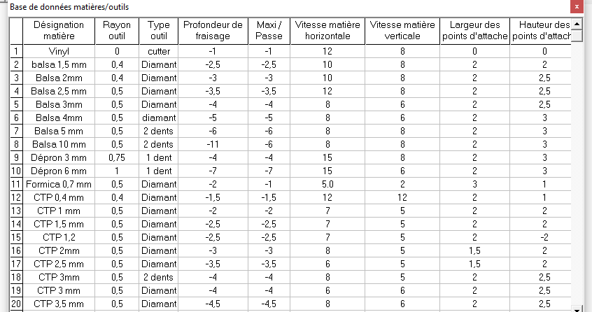 manu a écrit : 11 févr. 2020, 21:46 Perso, pour le balsa je mettais : avec une fraise 1 dent - avance 800mm, avec 2 dents - avance 1600mm.