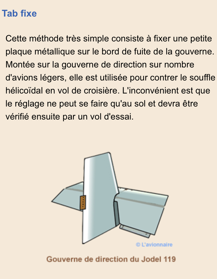 Voilà, vous avez toute l'explication. qu''on l'appelle TAB ou FLETTNER ne change rien à l'affaire, même s'il n'est pas commandé par le pilote. On le règle au sol après essais pour que le souffle hélicoïdal soit compensé "en croisière". Et ensuite, on n'y touche plus. Ce qui implique de corrriger le souffle hélicoïdal pour tout autre régime de vol que la croisière. Ca oblige donc à mettre du pied à droite en montée, et à gauche en dscente, avec le moteur qui tourne dans le sens horaire (négatif pour les matheux