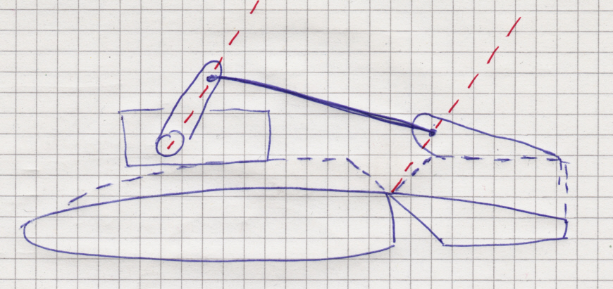Un croquis est un peu plus parlant (en pointillé bleu la partie centrale surélevée du stab) Idéalement ma tringle devrait encore être perpendiculaire aux deux axes rouges, ce n'est pas tout à fait le cas, mais l'écart réel est cependant moins prononcé que sur le croquis.