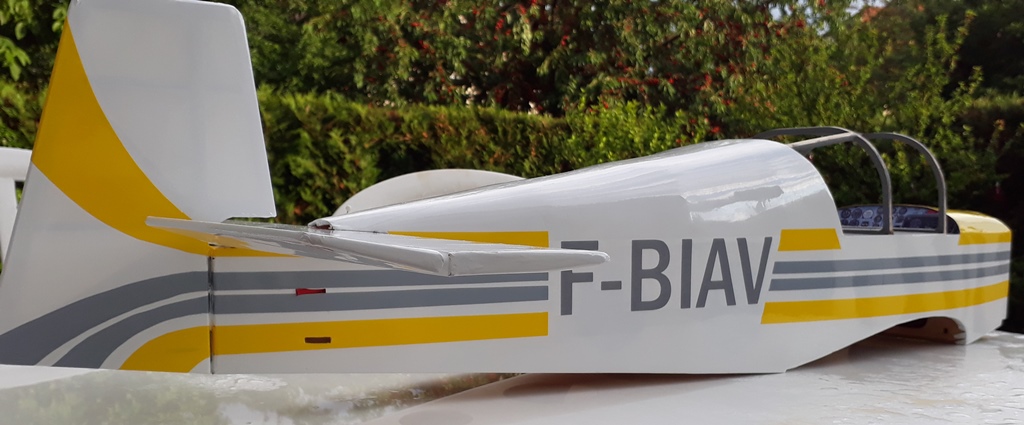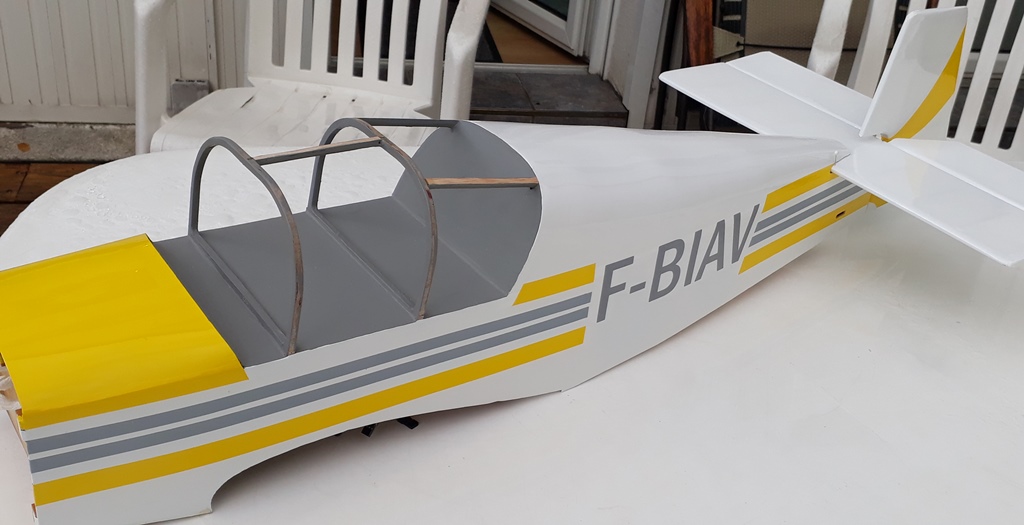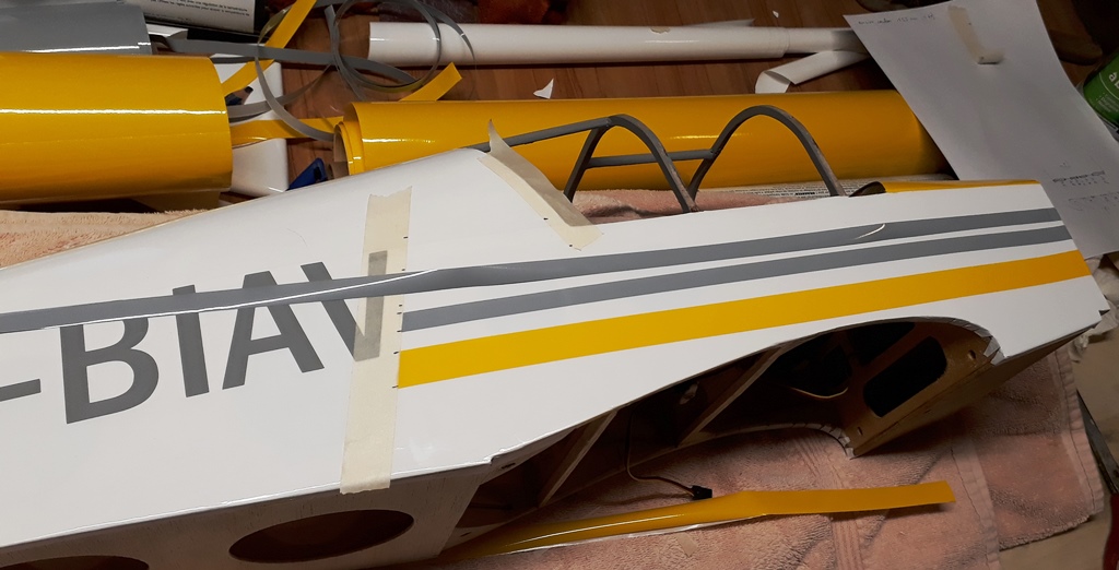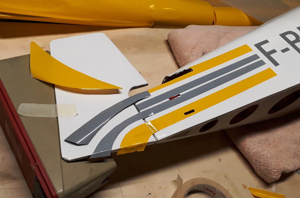 Pose des bandes latérales en Oracover. L'immatriculation est légèrement plus foncée que les bandes grises car réalisée en vinyl adhésif d'une couleur approchante.