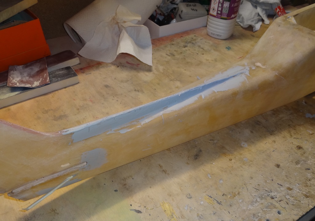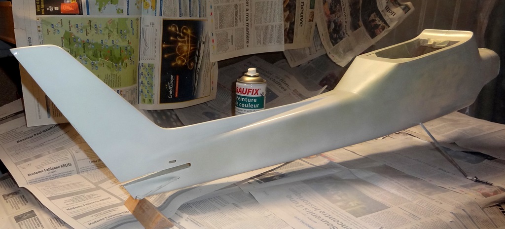 Il a d'abord fallu boucher à l'enduit les grosses irrégularités (ici l'arête dorsale qui était ouverte sur l'ancien fuselage et dont j'ai dû relier les 2 parties par une bande de fibre de verre, ce qui a généré une sur-épaisseur)
