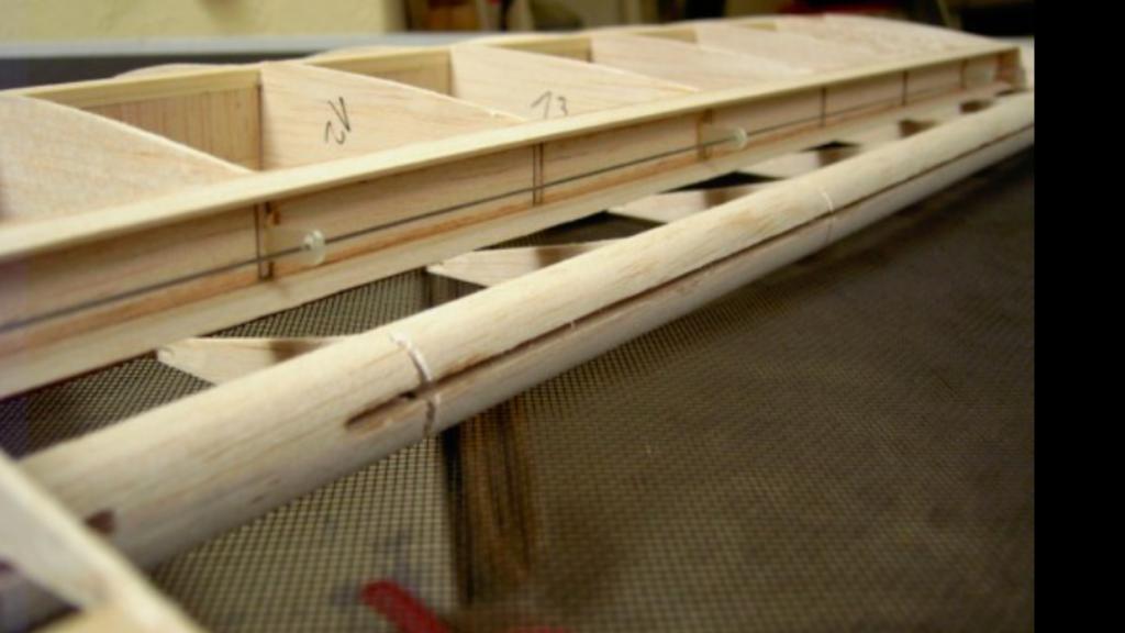 Ensuite il faut combler entre les queues de nervure avec du balsa qui sera poncé à la forme du profil afin de recevoir la deuxième bande de CTP 0.8 x 15 mm. Ainsi l'on obtient un bord de fuite très rigide et rectiligne.