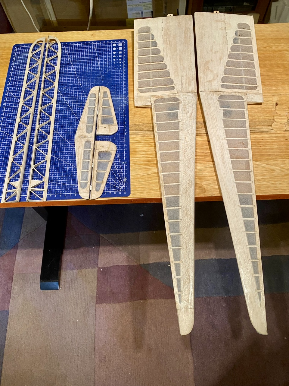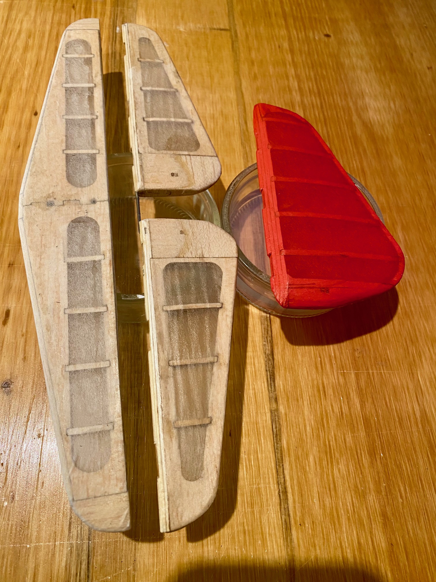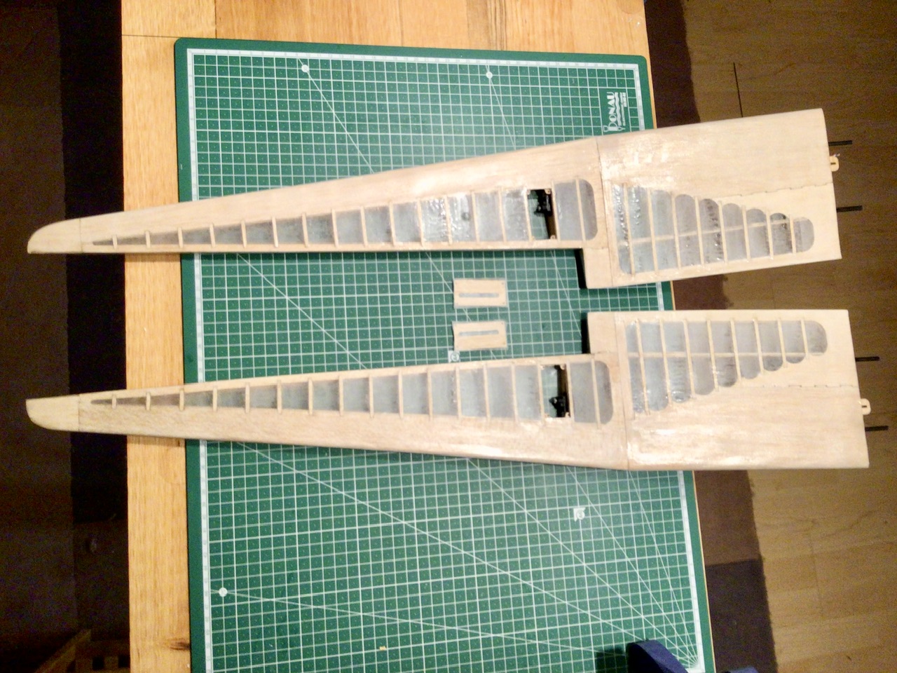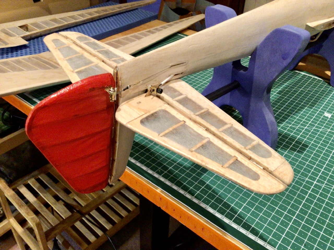 Aujourd'hui, j'ai passé un peu de temps pour modifier les gouvernes de profondeur et de direction. J'ai d'abord rendu solidaire les deux gouvernes de profondeur avec un brin de CAP plié en U et collé à l'époxy, ensuite, j'ai remplacé les charnières tissus par des classiques avec axe métallique.
