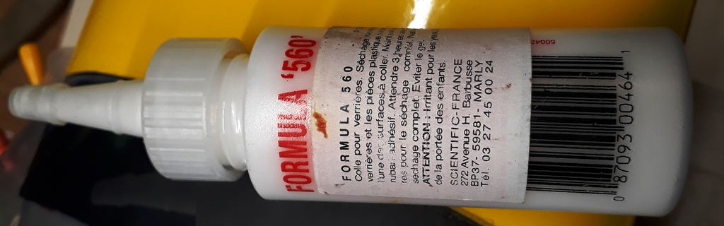 Voici la colle que j'ai utilisée. L'étiquette Scientific France cache partiellement l'origine