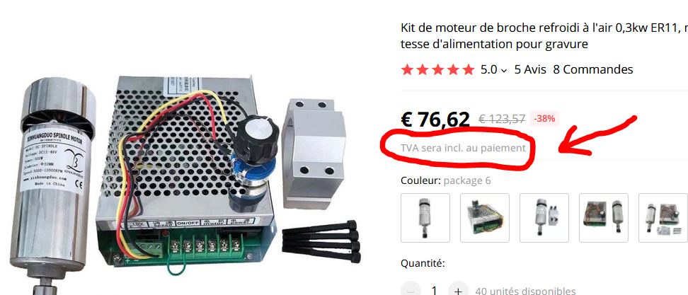 Par contre j'attends toujours une broche 300W pour la petite CNC, d'un coût d'un peu plus de 70 €, dont on m'a annoncé l'arrivée en pays de destination le 30 juin et depuis toujours rien (encombrement à Roissy lié à l'absentéisme en période de vacances ou tracasserie douanière ??? :oops: ). Lors de la commande il n'y avait pas encore la mention de cette taxe.