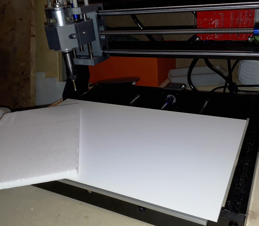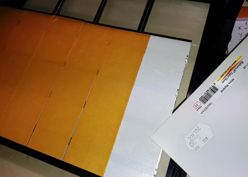J'envisage de fixer le martyr (en dépron 6 mm) par collage. Afin d'avoir une surface bien lisse pour cela j'ai commencé par coller une plaque en ABS de 2 mm (choix déterminé par ce que je possédais) avec du double face sur le plateau alu. (collage quasi définitif) Pour l'instant je teste le collage du dépron avec de la colle repositionnable en bombe (ça semble tenir mais je n'ai pas encore fait d'essai). Si NOK j'utiliserai aussi du double face, mais ce sera plus galère pour remplacer le martyr de temps en temps.