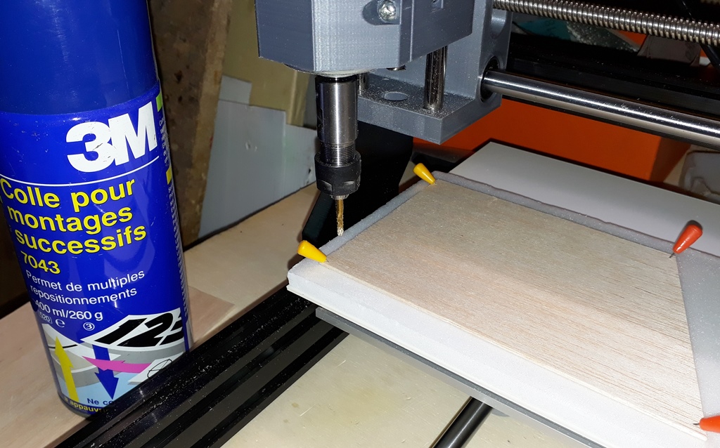 Enfin pour la fixation du balsa ou CTP j'ai mis une vaporisation de colle sur le dessous et quelques épingles. Là aussi l'expérimentation reste à faire. Il faudra probablement compléter par du ruban adhésif gris qui se déchire à la main, comme sur la vidéo.