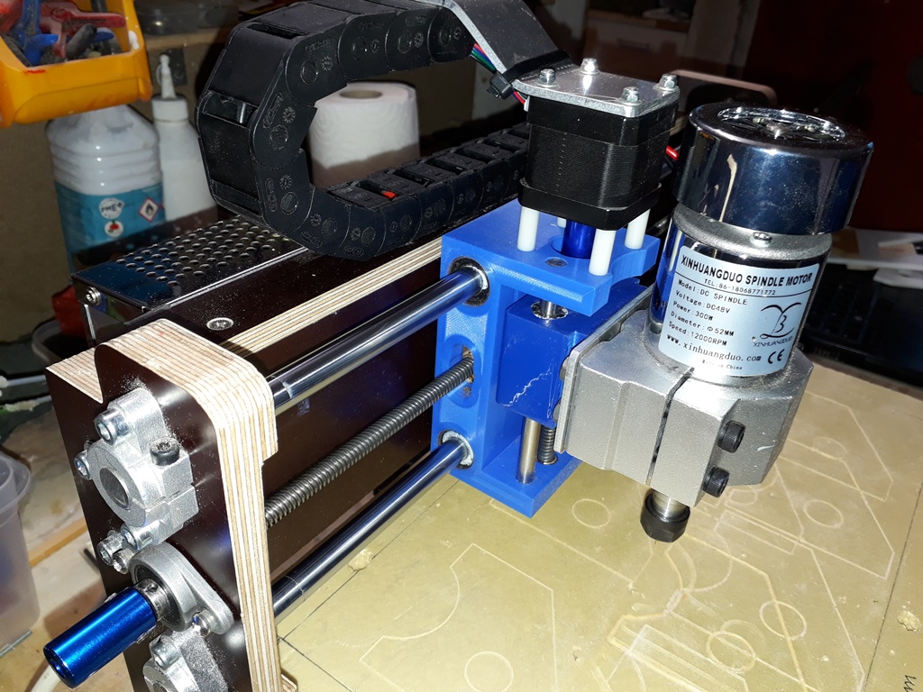 Cette construction devait s'achever avec la broche d'origine de la 3018, mais le souhait du futur utilisateur m'a amené à lui monter la même broche qu'utilise yoyo, après que ce dernier nous ait confirmé la qualité de cette pièce.