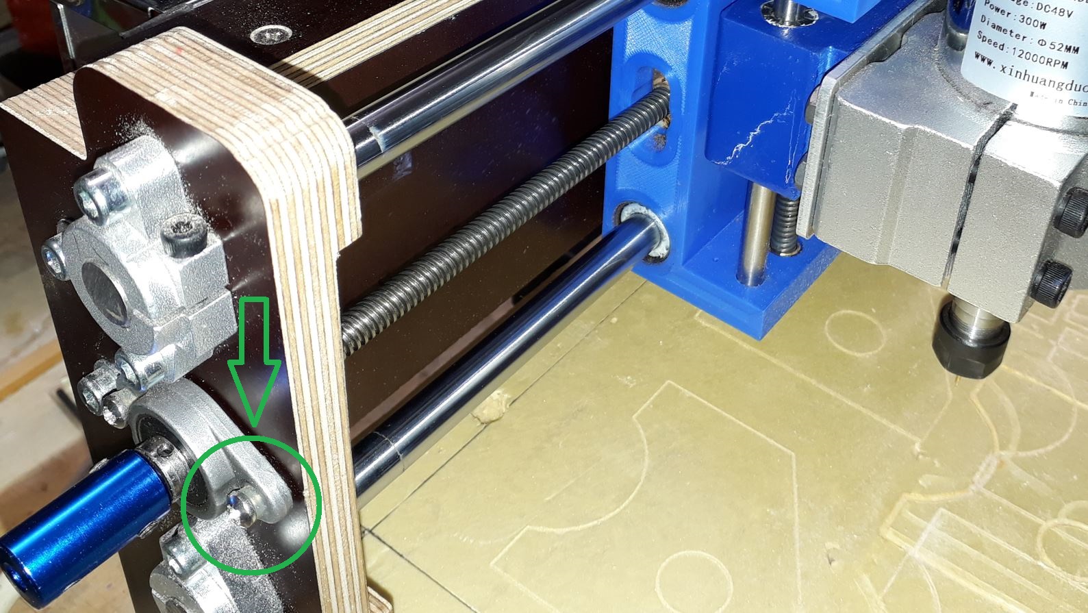 Sur la grande CNC équipée de rails MGN que j'utilise j'ai supprimé le roulement gauche (qui n'était inséré qu'à mi épaisseur du flanc en bakélite noire) et la vis prend appui dans la seconde demi-épaisseur (extérieure) en bakélite qui comportait un trou légèrement supérieur à son diamètre. Donc il y a un léger jeu.