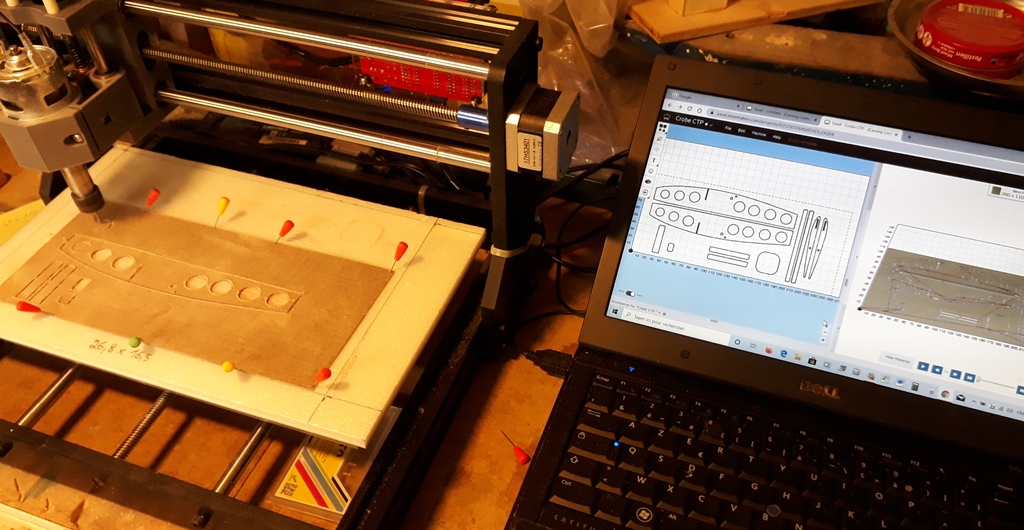 Voici la découpe des pièces en CTP 4/10 destinées au Crobe. C'est avec certaines de ces pièces un peu complexes que l'intérêt de la CNC devient évident. même avec un si petit modèle de fraise ;)