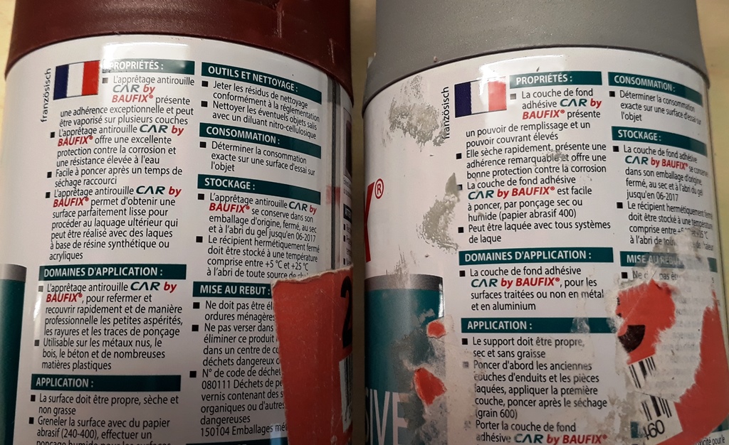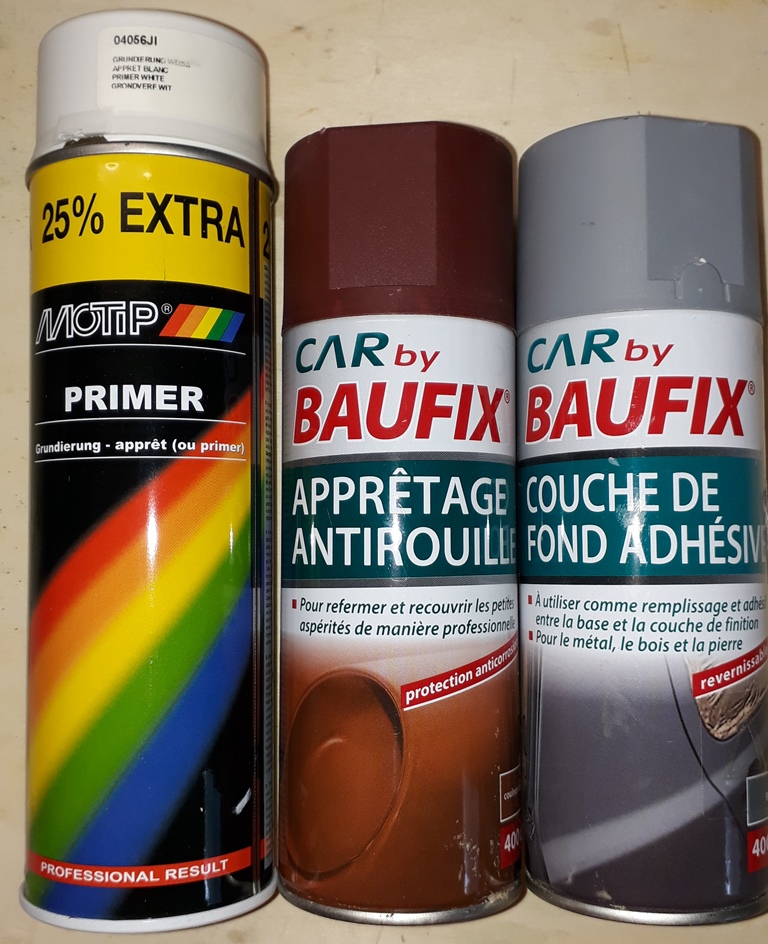 Le Motip est un classique qu'on trouve chez nous dans les magasins auto, mais aussi un peu partout sur le net, avec des prix allant du simple au triple ! Yoyo l'utilise aussi. J'avais du "primer" à ma disposition mais il faudrait plutôt du "filler", plus épais, qui existe dans la même marque.