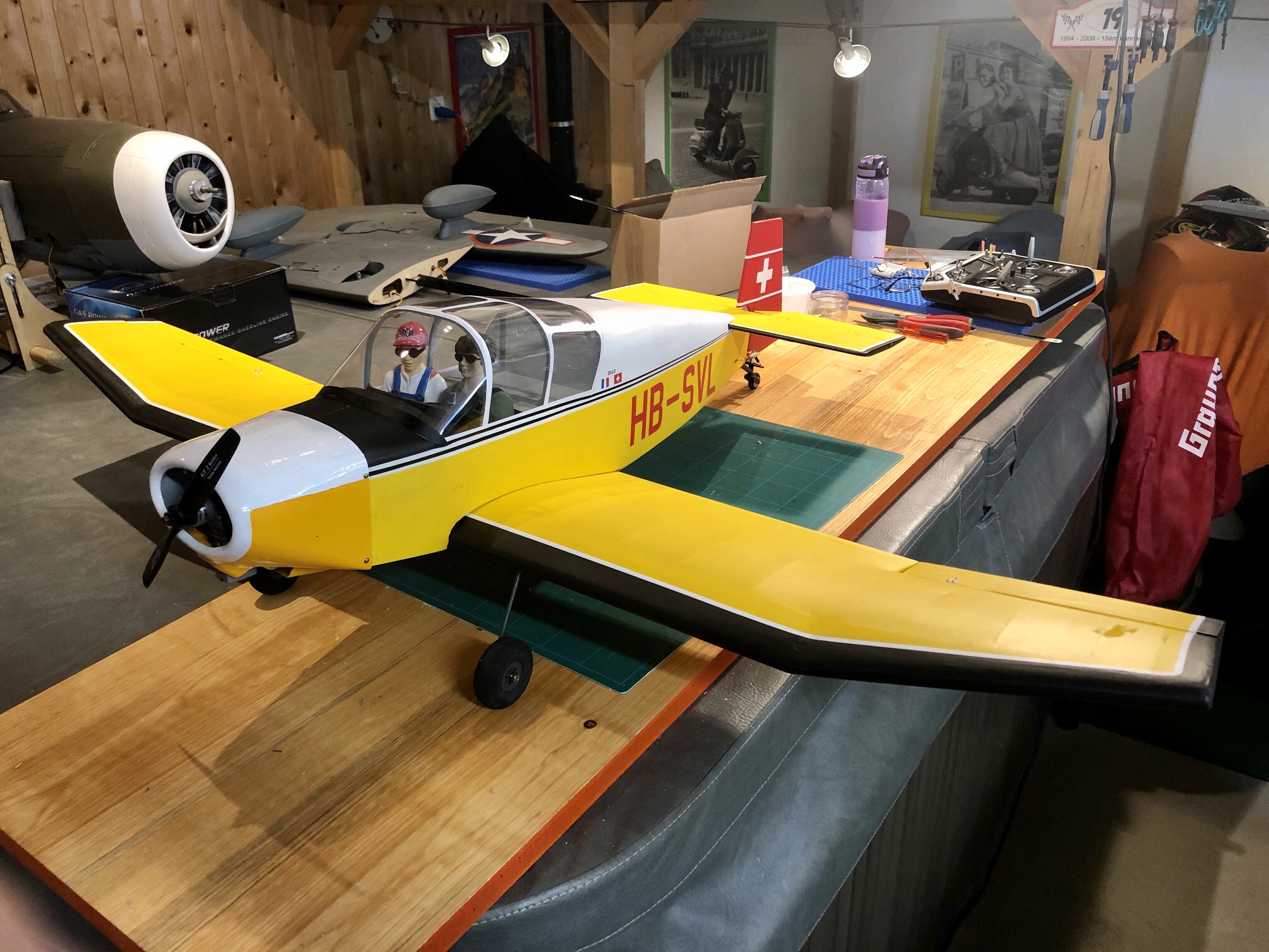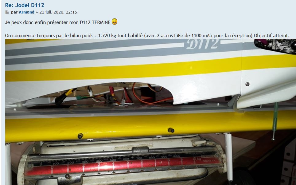 Et la bonne nouvelle! 1,7 kg accu Life 1700 compris et réservoir vide naturellement, c’est pas si mal pour un zing entoilé à l’Oratex multi couches, avec 2 bustes de pilote, dont un heu...plutôt costaud et un capot qui a été bardouflé (tiré du dictionnaire helvétique Le P’tit Manu aux éditions Bibi