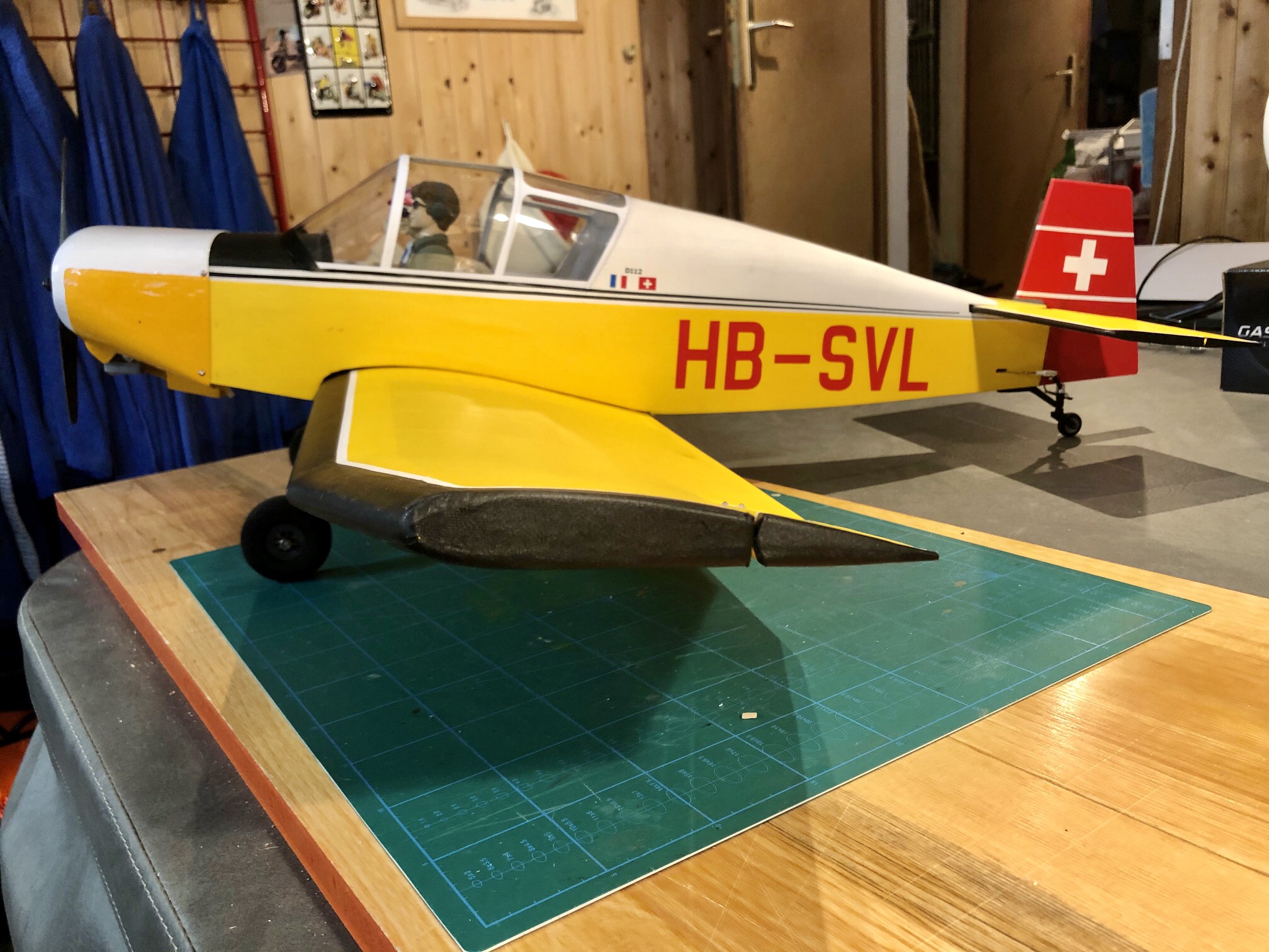 ) de 4 couches de peinture. Manque encore les deux carénages de train qui seront faits en balsa. Nous serons en dessous des 2 kg plein fait!