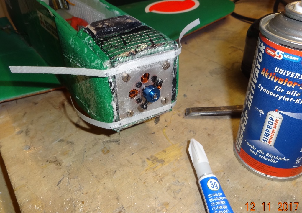 Mon couple moteur, très sollicité et recollé à plusieurs reprises a été renforcé pour le retenir aussi bien vers l'avant que vers l'arrière. D'abort pour contrer la traction vers l'avant j'ai utilisé des rubans d'emballage, déjà mentionnés pour le Eddie.