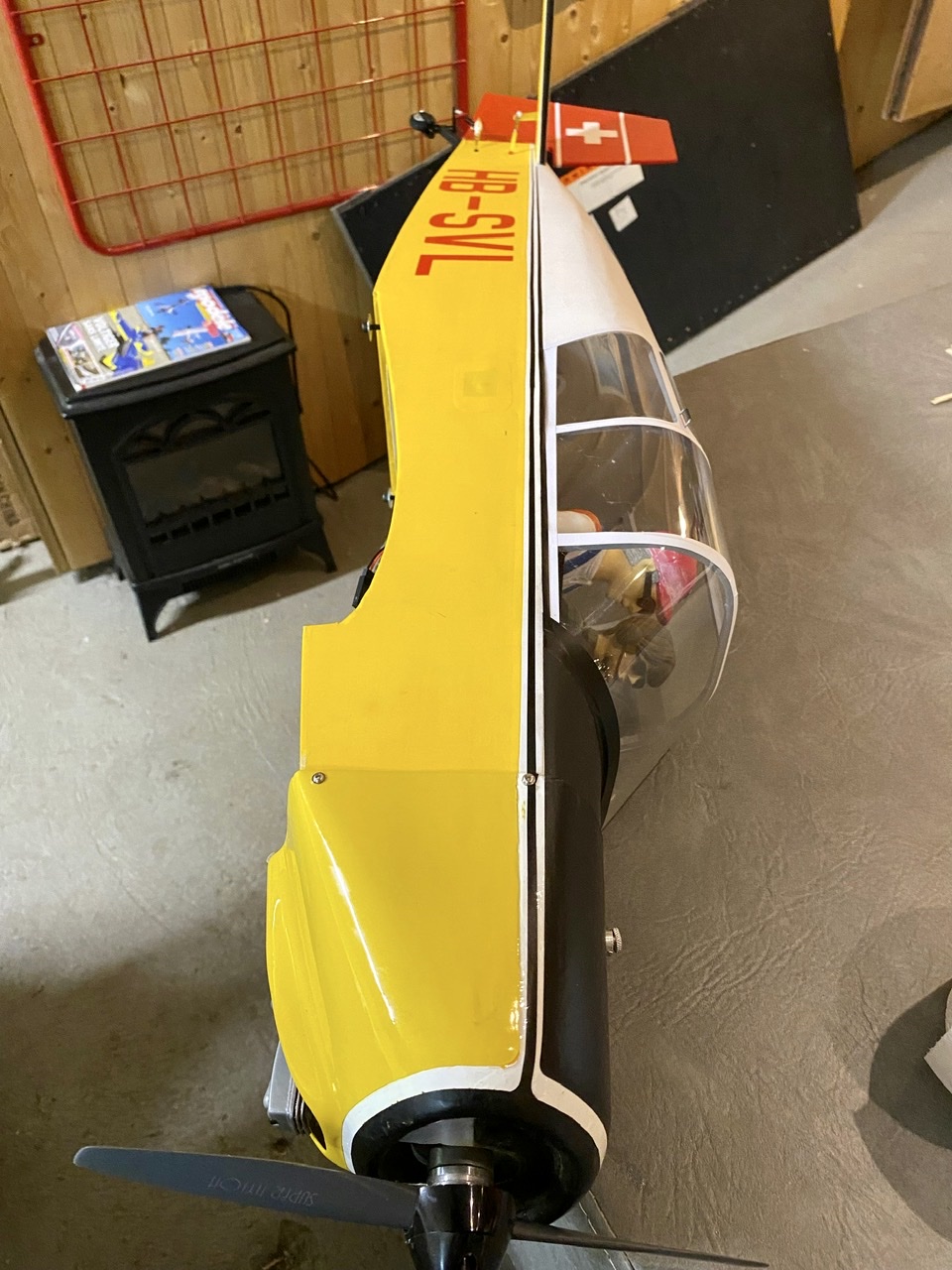 Comme Jeanmi, Didier et d’autres m’avaient conseillé lors de ma visite chez vous, j’ai cherché et trouvé dans un super marché, une bombe 2K dans une teinte très proche de celle de l’entoilage. La partie jaune du capot a donc été repeinte. J’ai également monté un petit interrupteur électronique et une hélice Super Nylon en 10x5 (ex Graupner). Le modèle est à nouveau prêt à prendre l’air ;) .