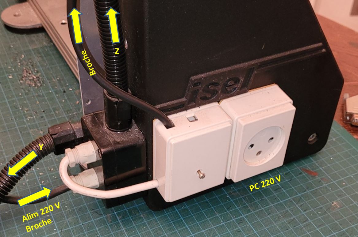 La broche est alimentée directement de l'extérieur en 220 V (à gauche), indépendamment de l'alim générale de la CNC (à droite)